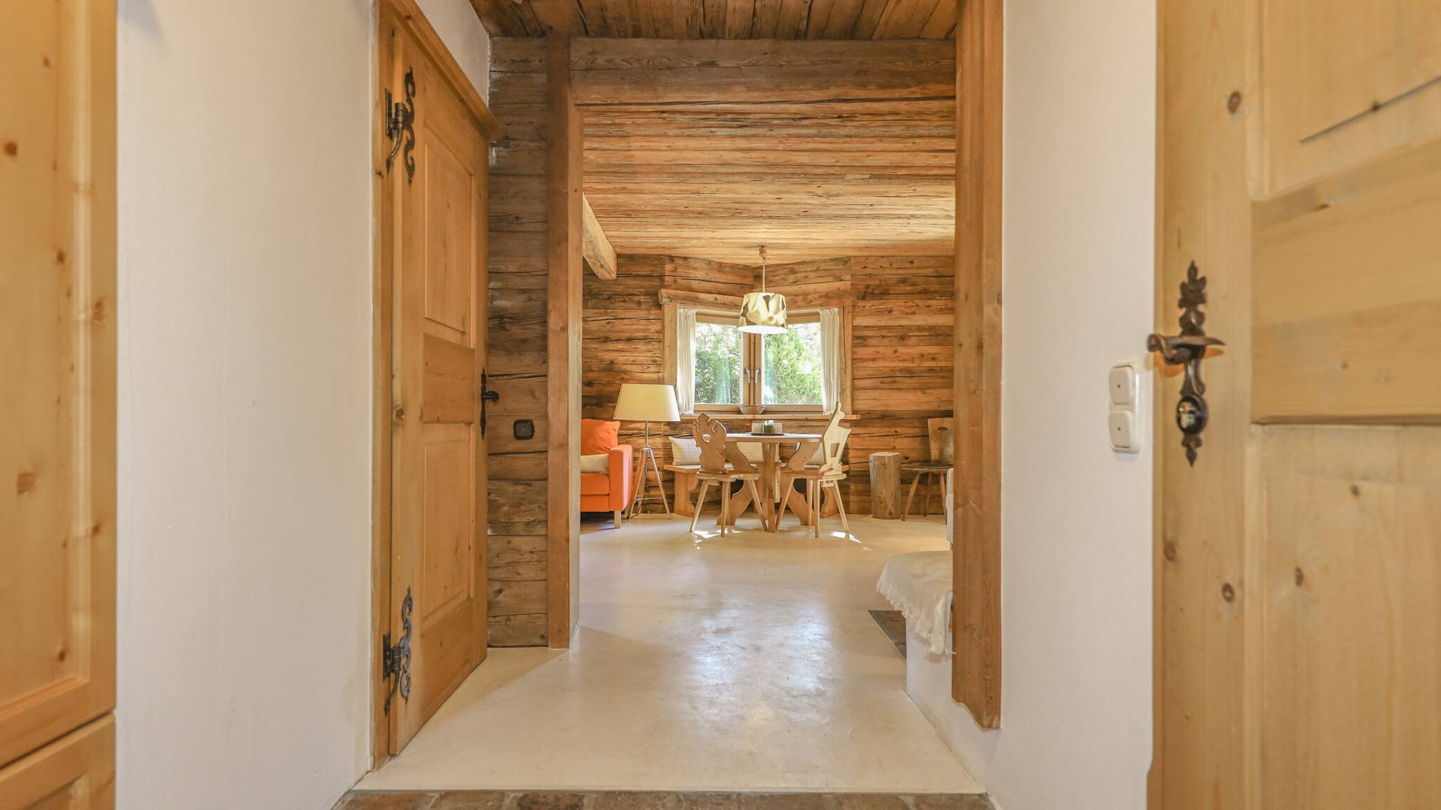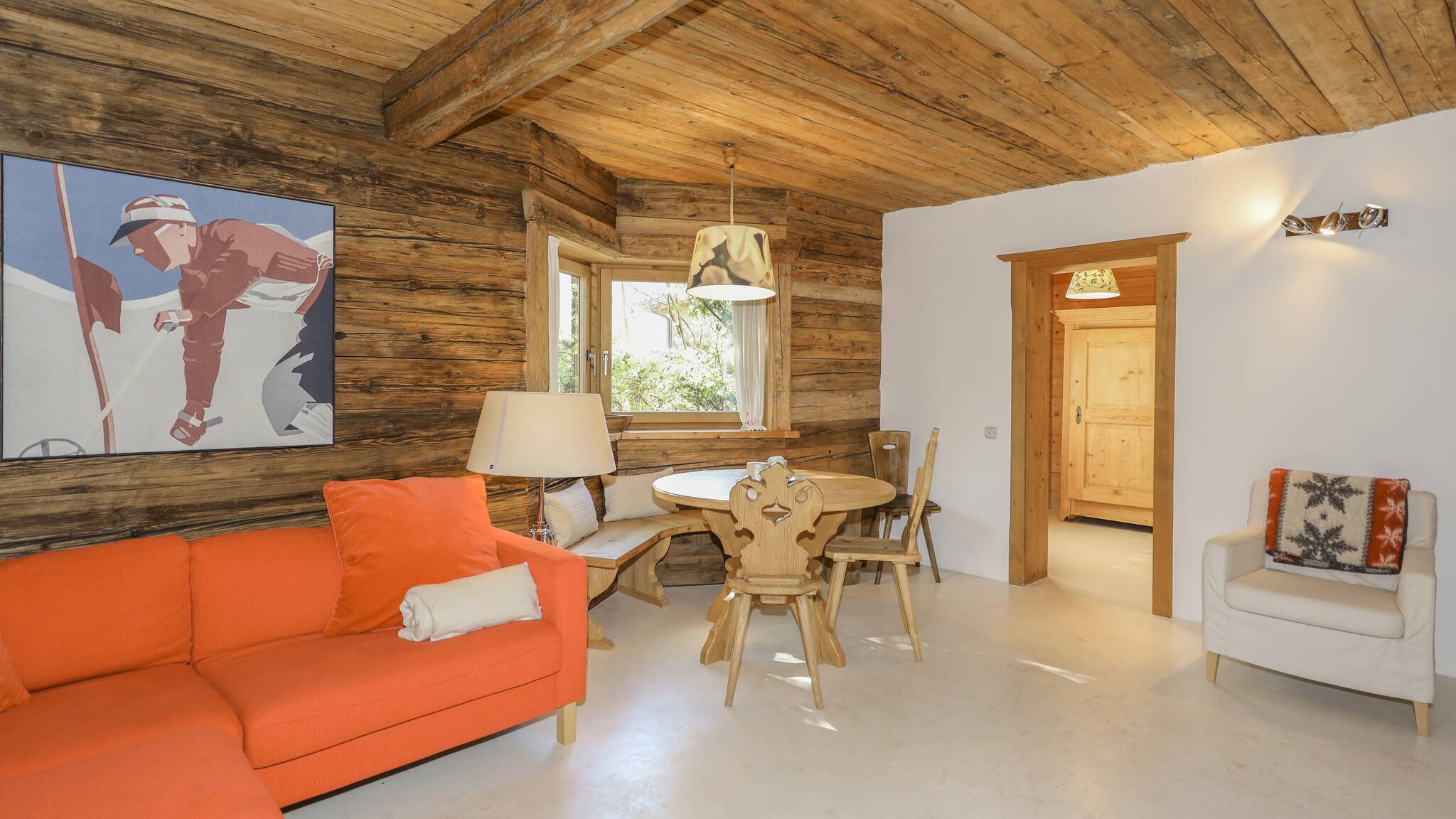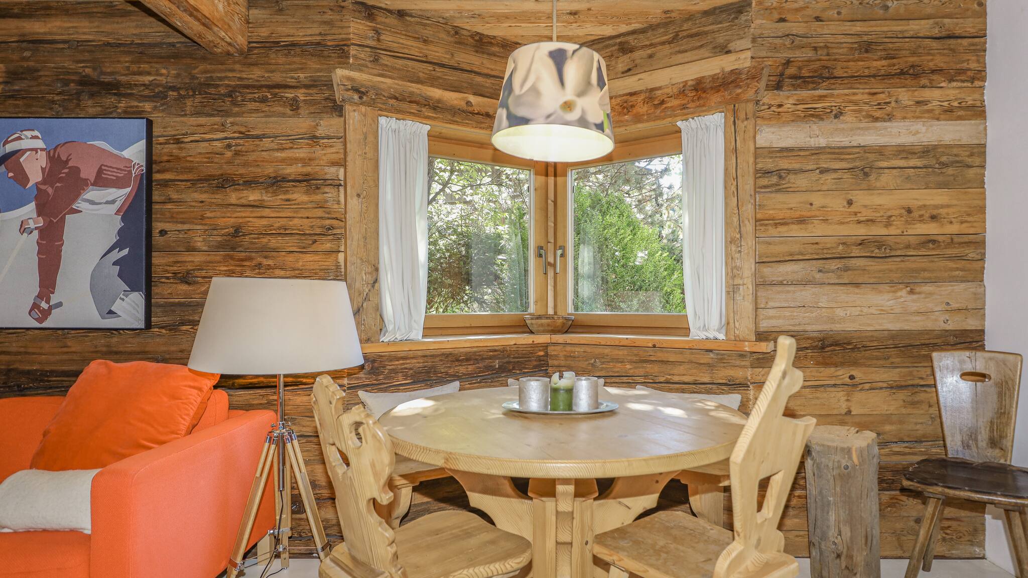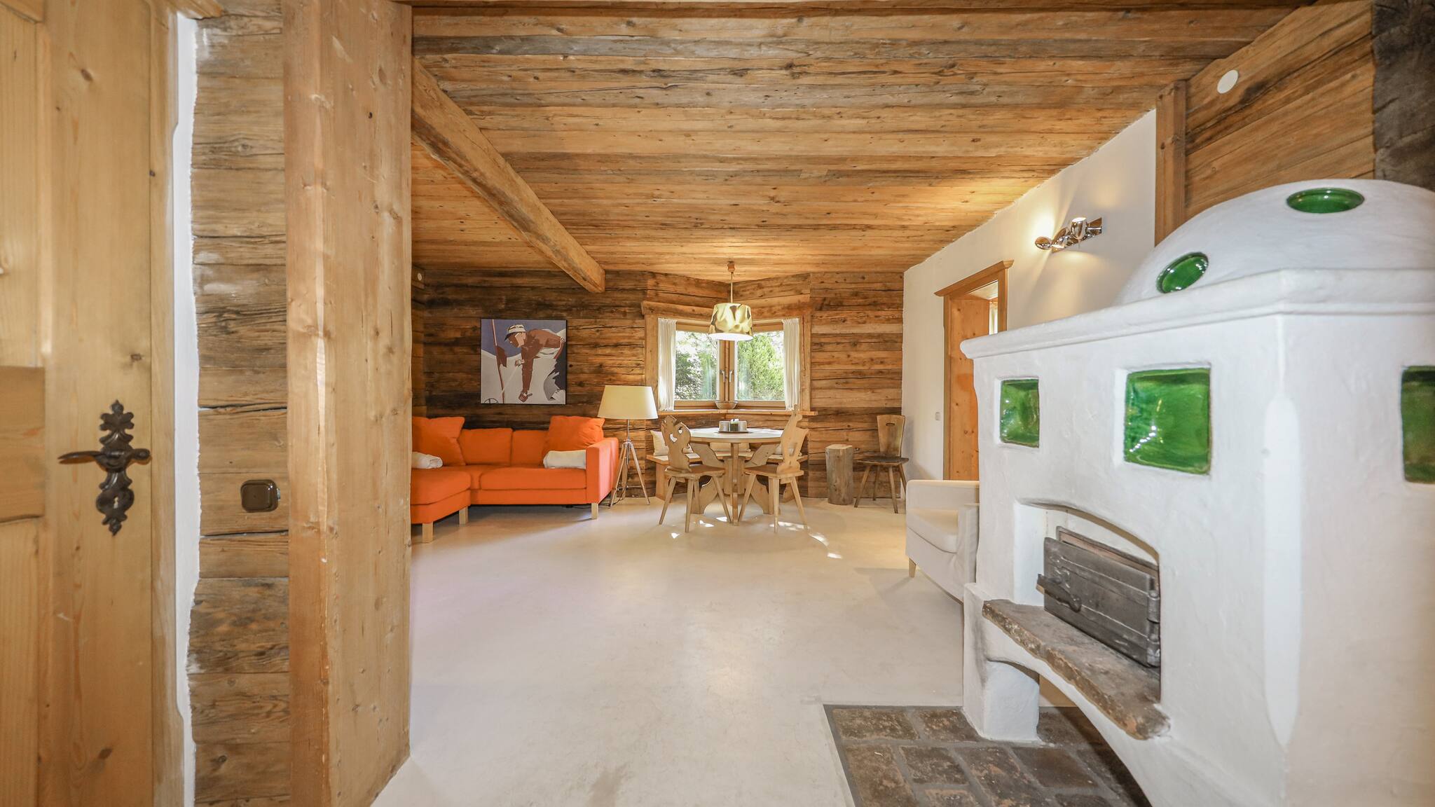 This charming apartment with a traditional tiled stove is located in an alpine chalet surrounded by old trees – a place to breathe, unwind, and feel at home. Warm wooden ceilings and walls create a cozy atmosphere full of rustic charm.