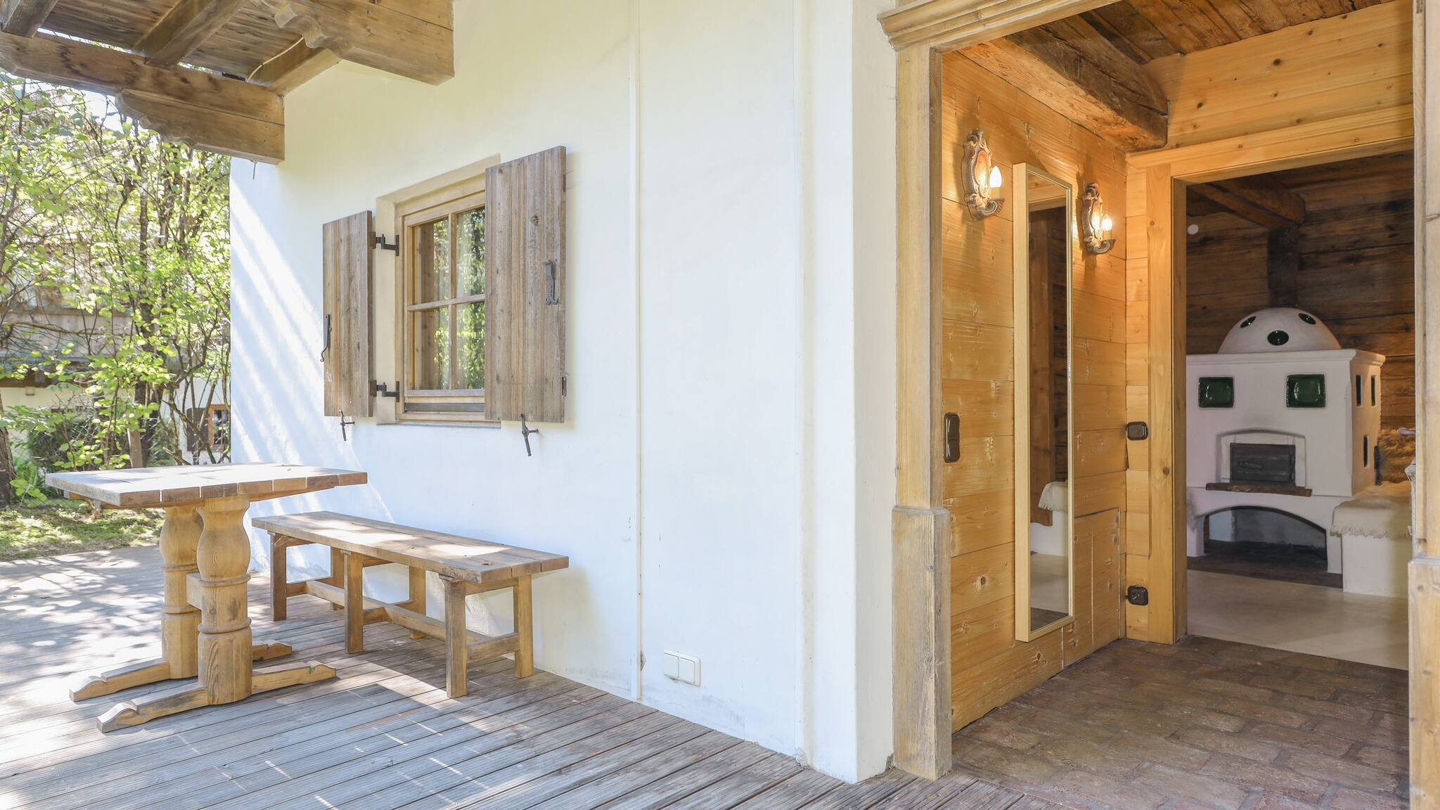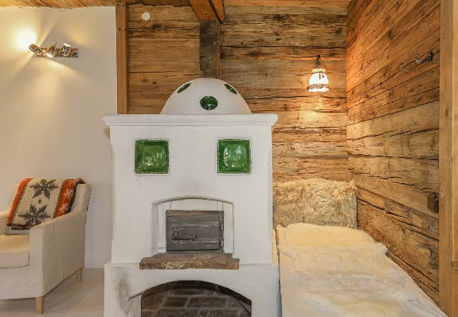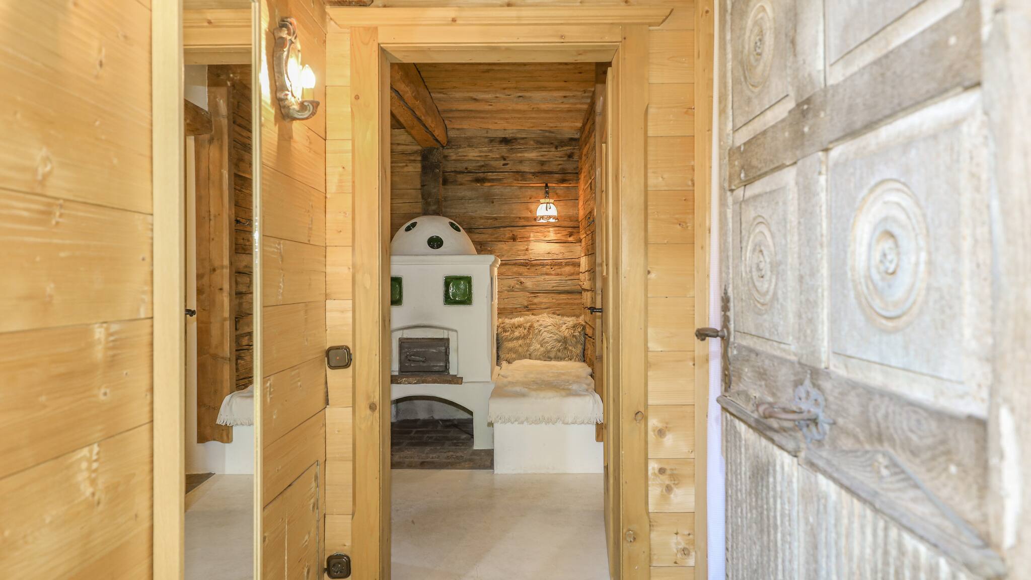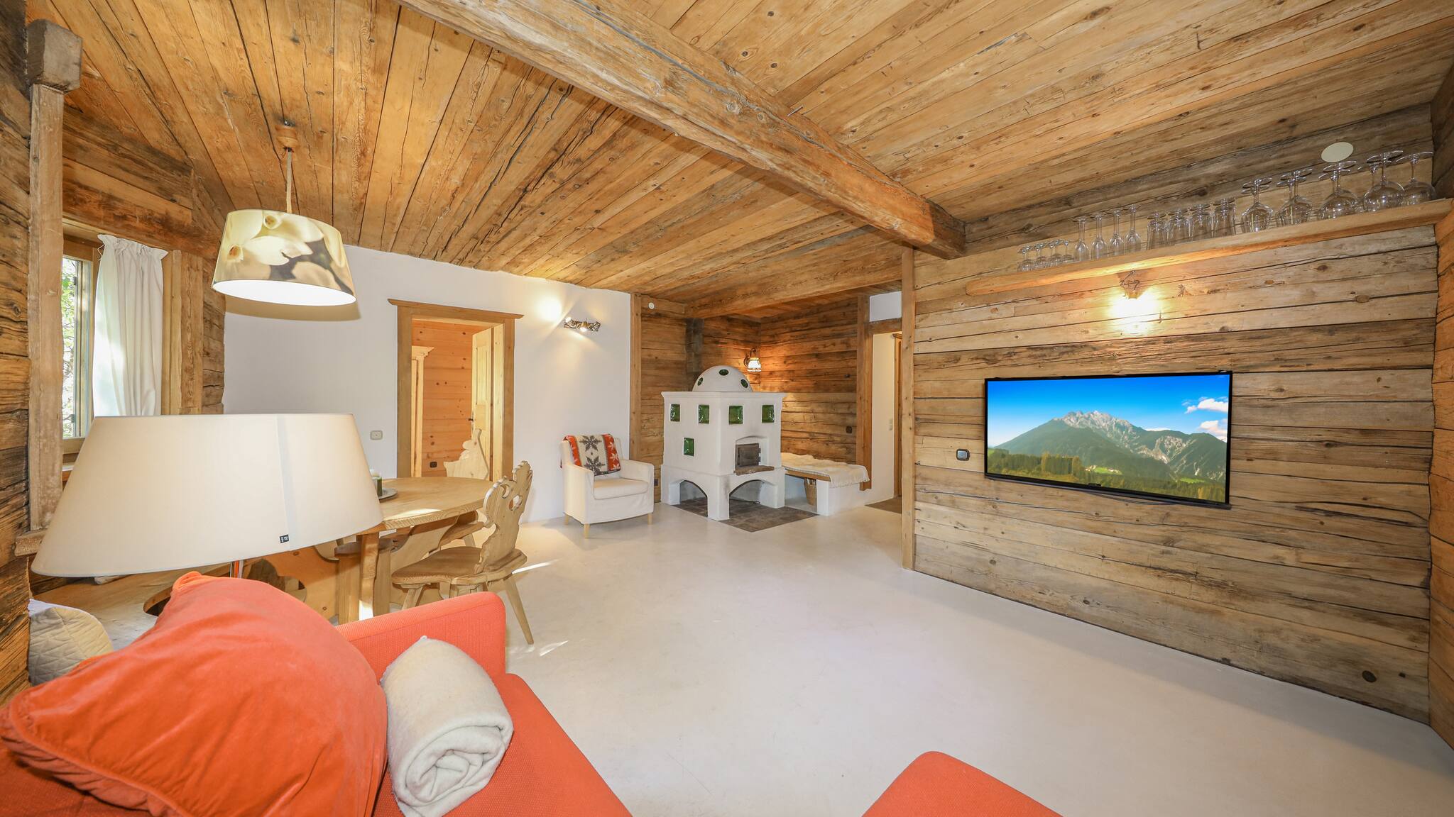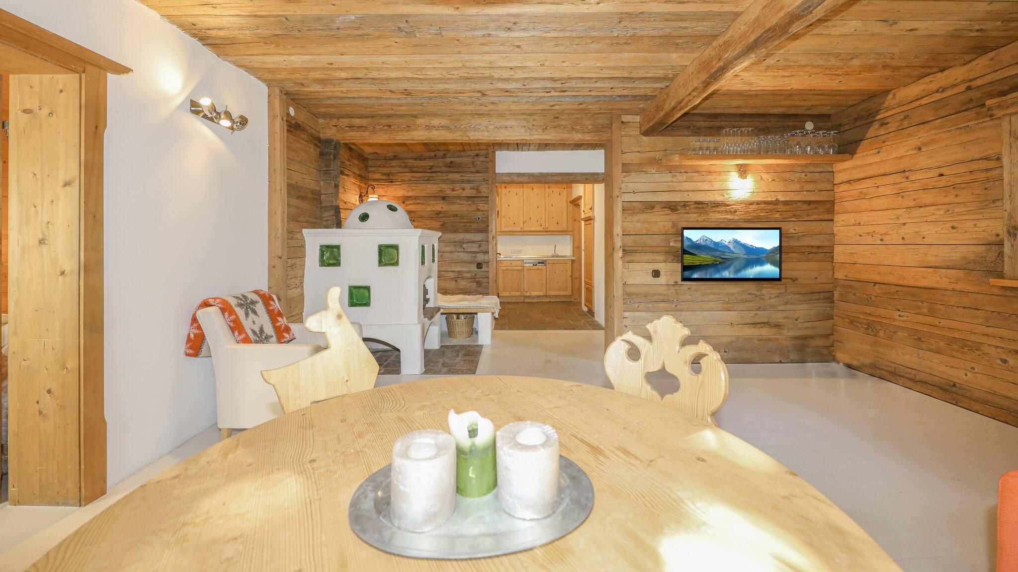 This charming apartment with a traditional tiled stove is located in an alpine chalet surrounded by old trees – a place to breathe, unwind, and feel at home. Warm wooden ceilings and walls create a cozy atmosphere full of rustic charm.