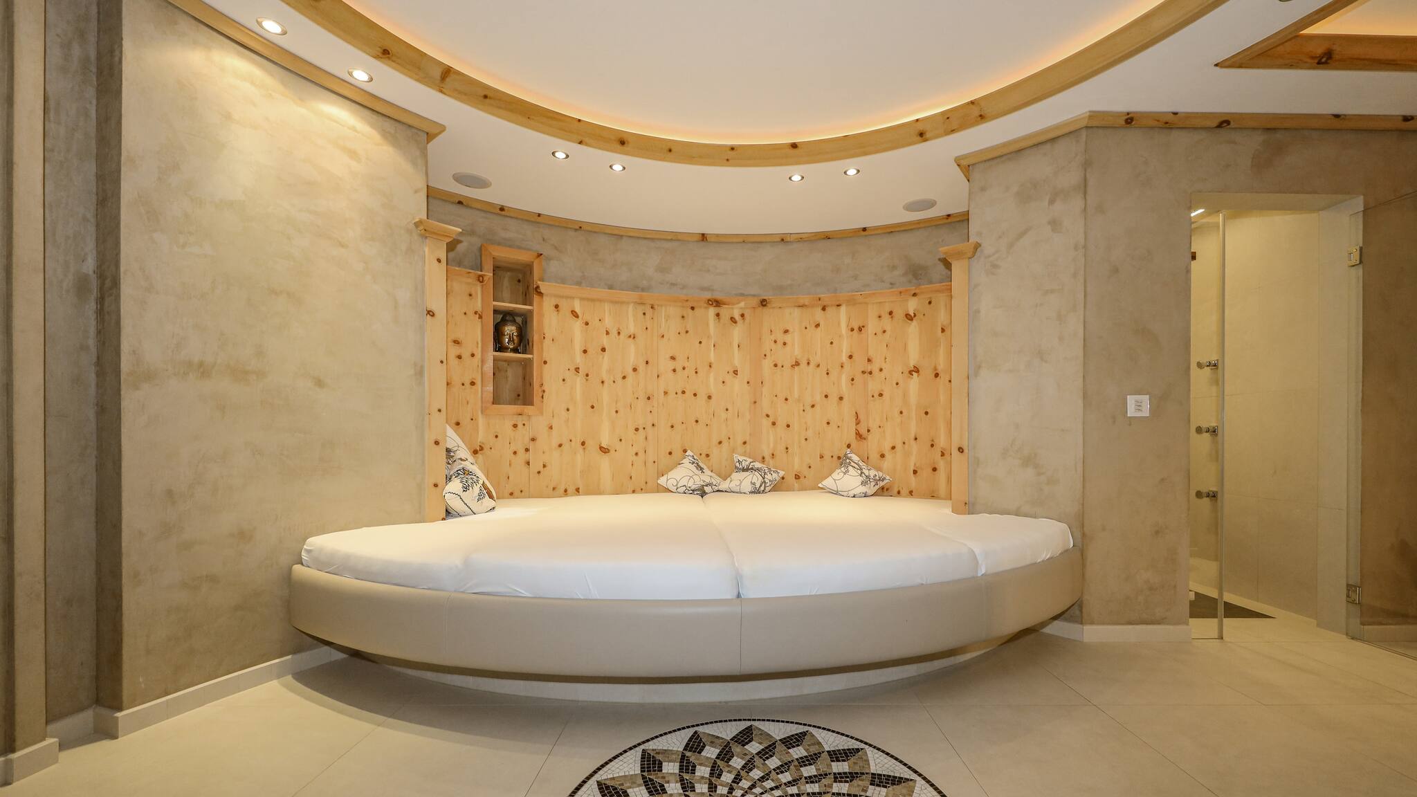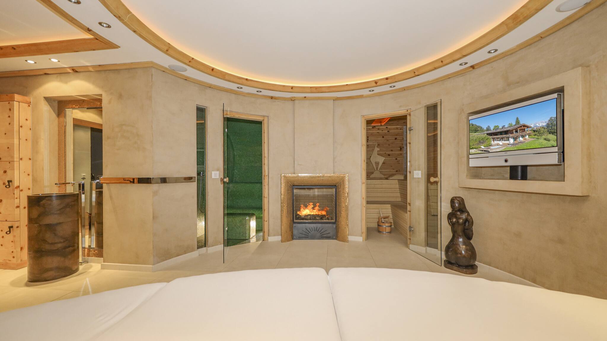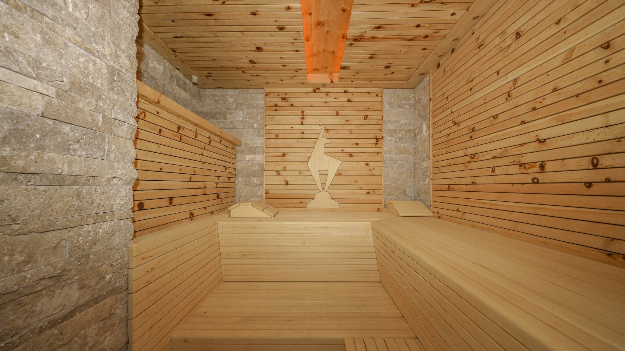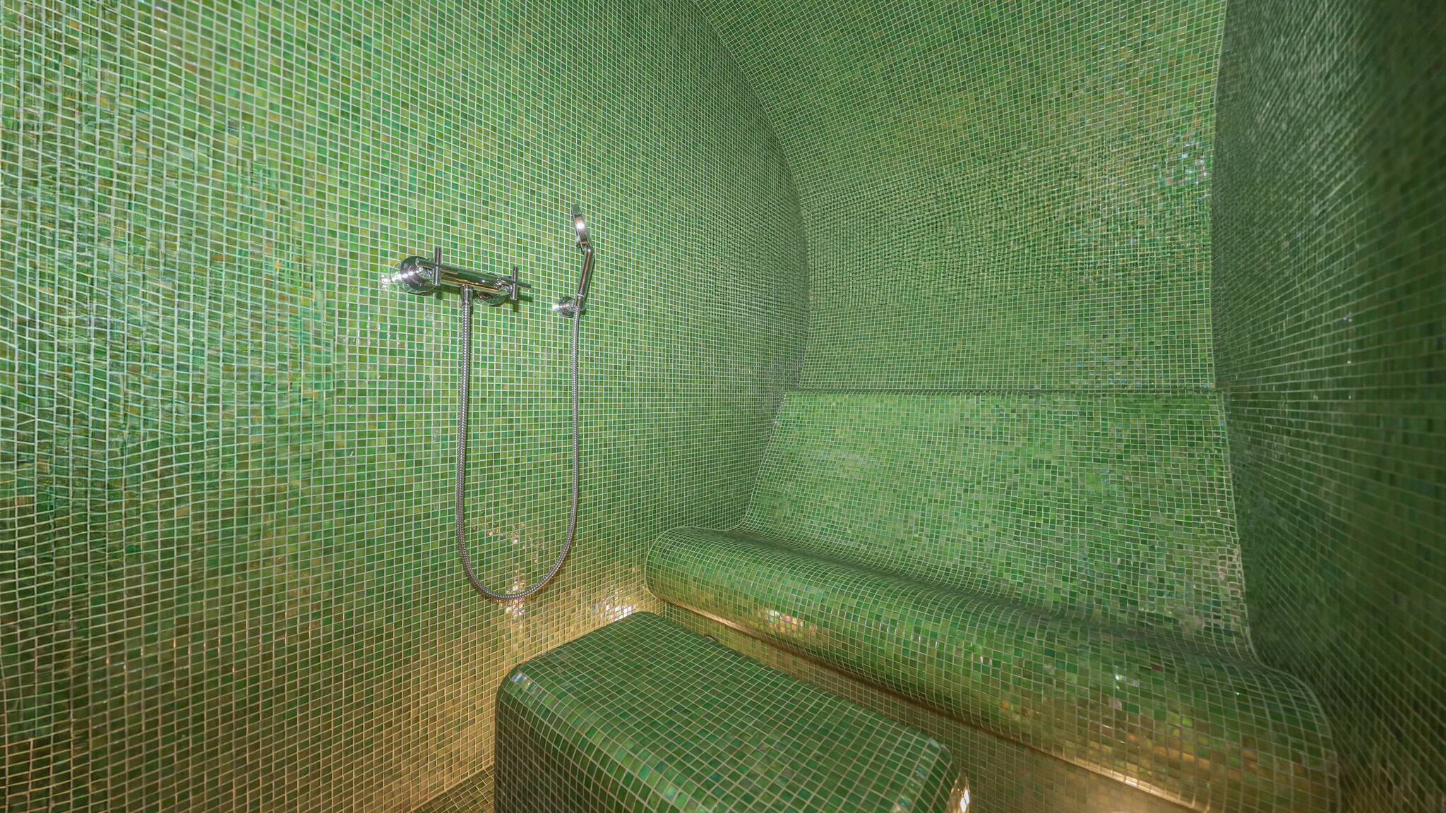 The private spa area includes a sauna, steam bath, and relaxation lounge.