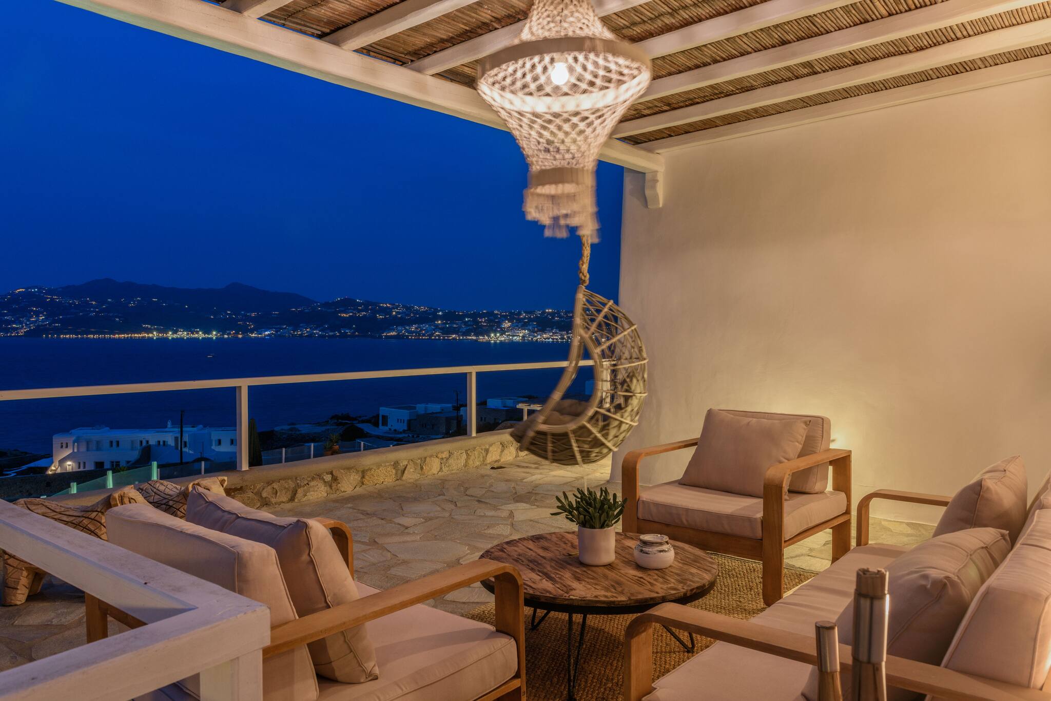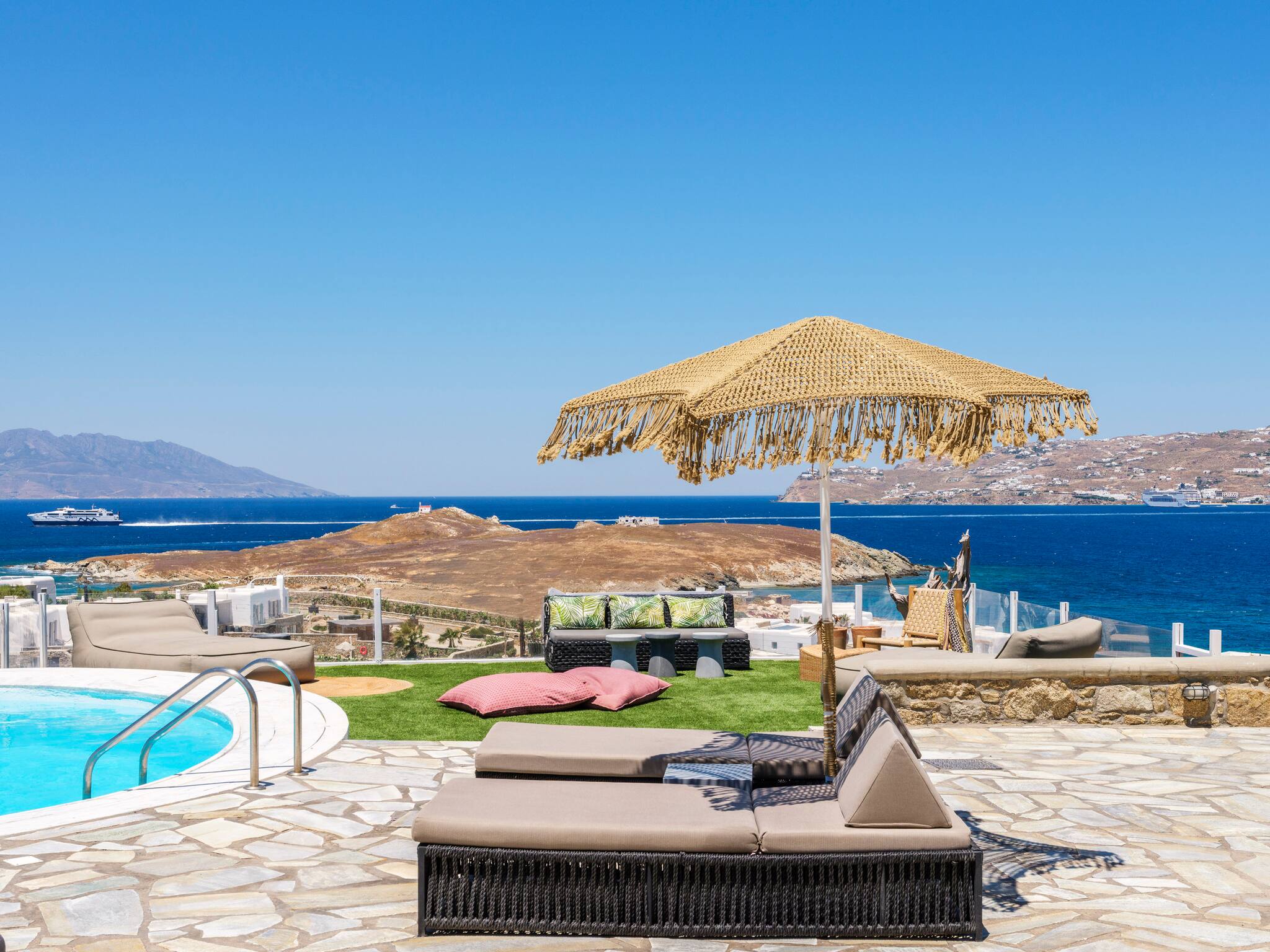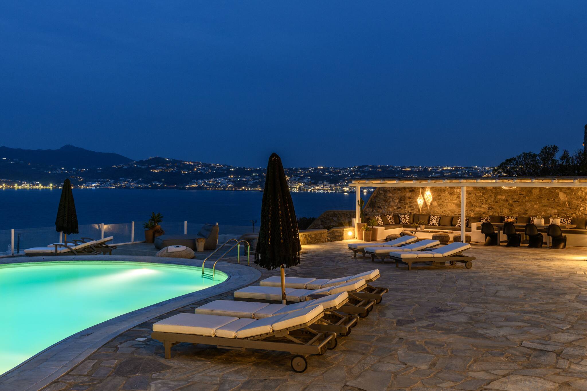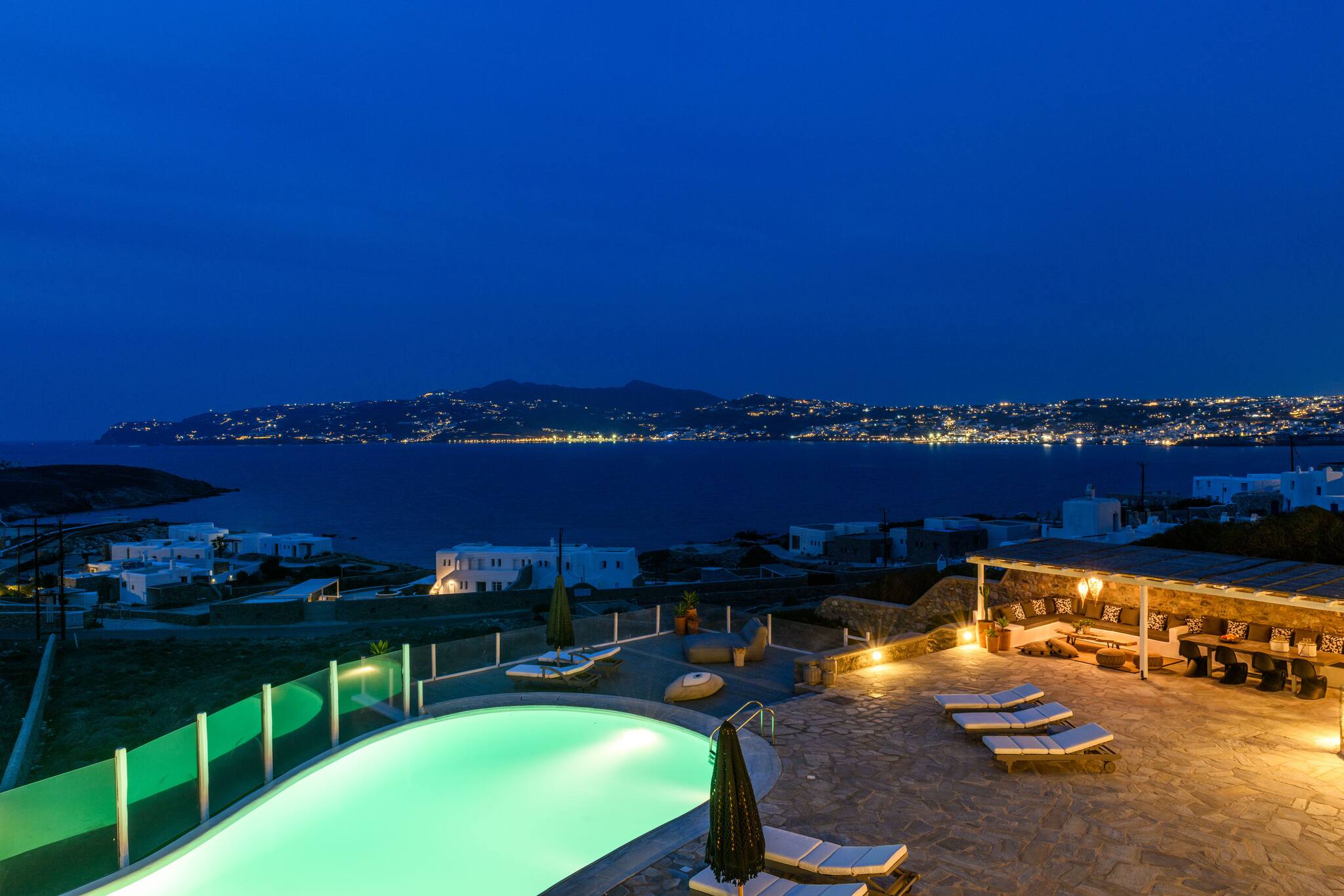 The villa offers breathtaking panoramic sea views extending to the port of Mykonos and Chora. When the cruise ships are illuminated at night, the view is simply magical. The pool area enjoys sunshine throughout the day and stunning sunsets in the evening.