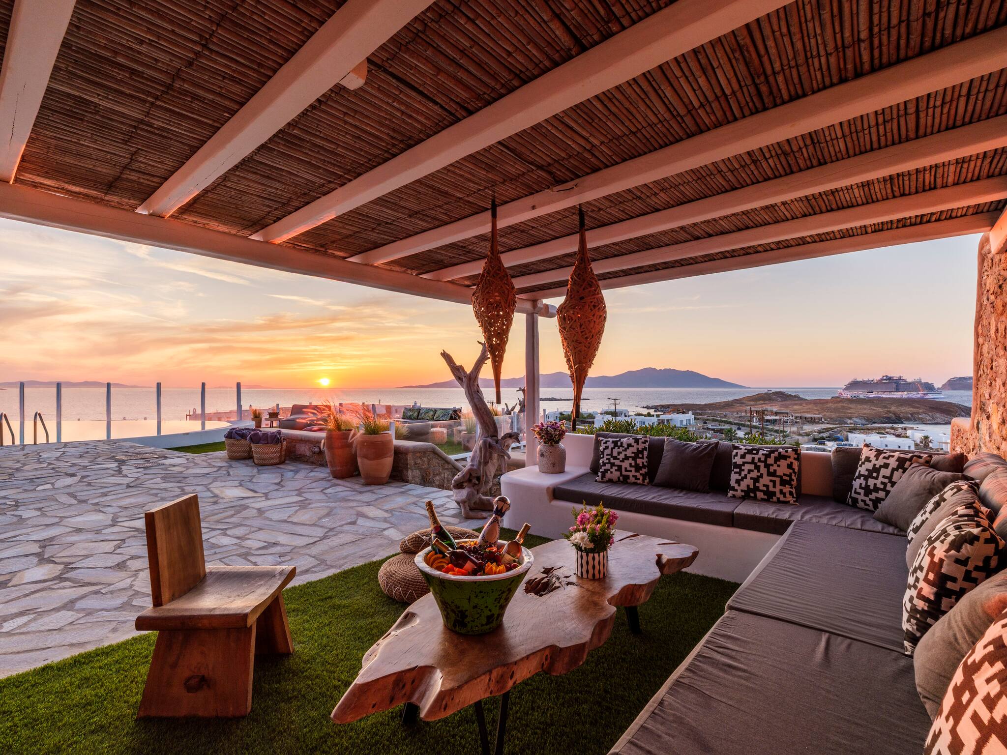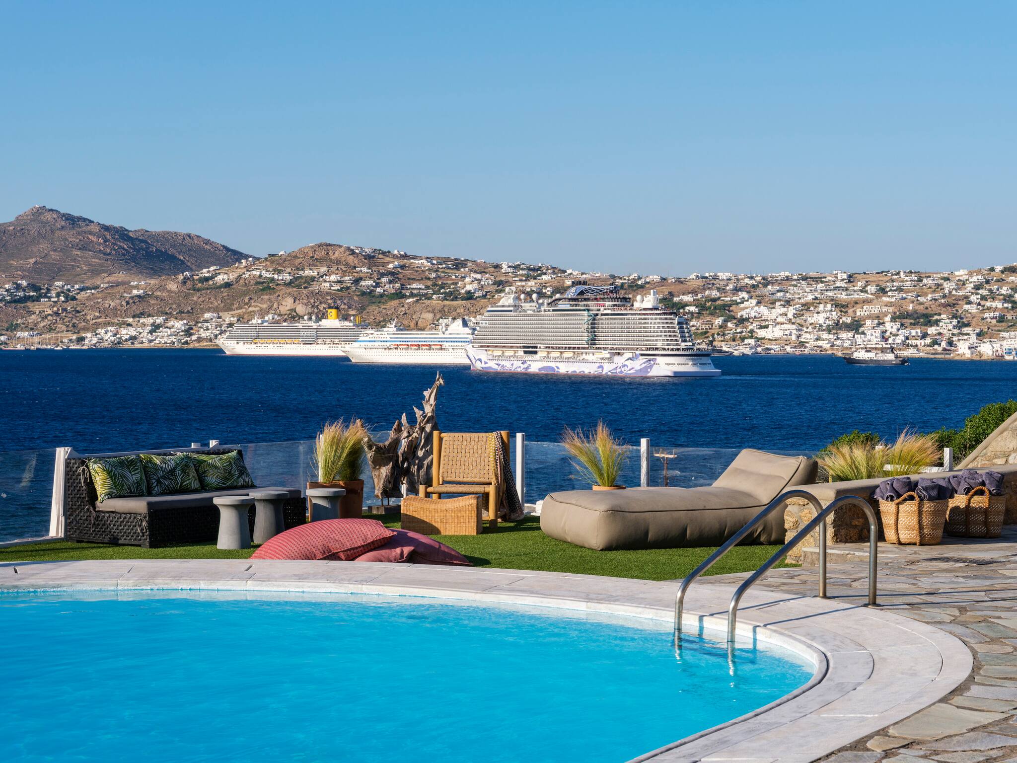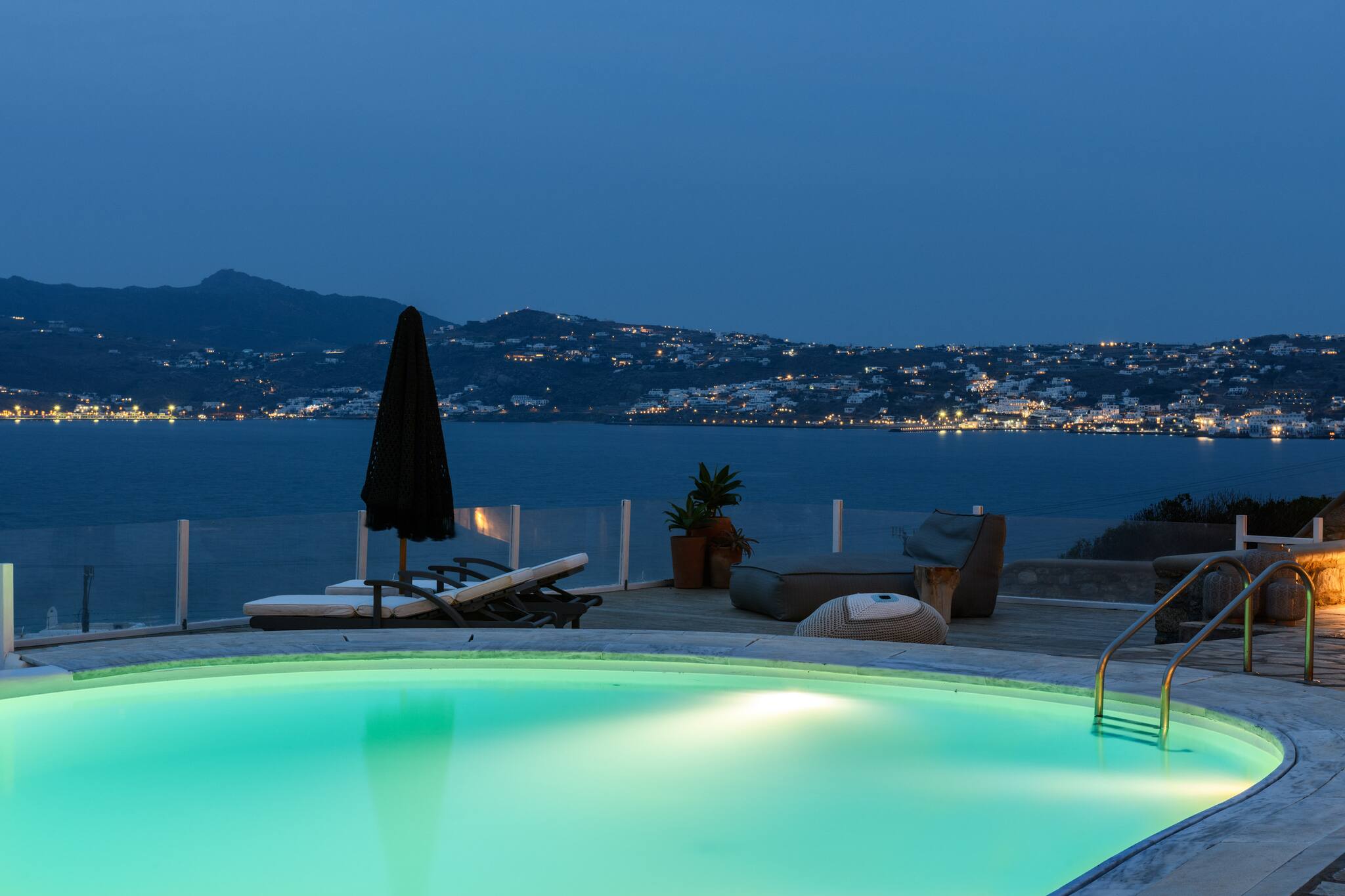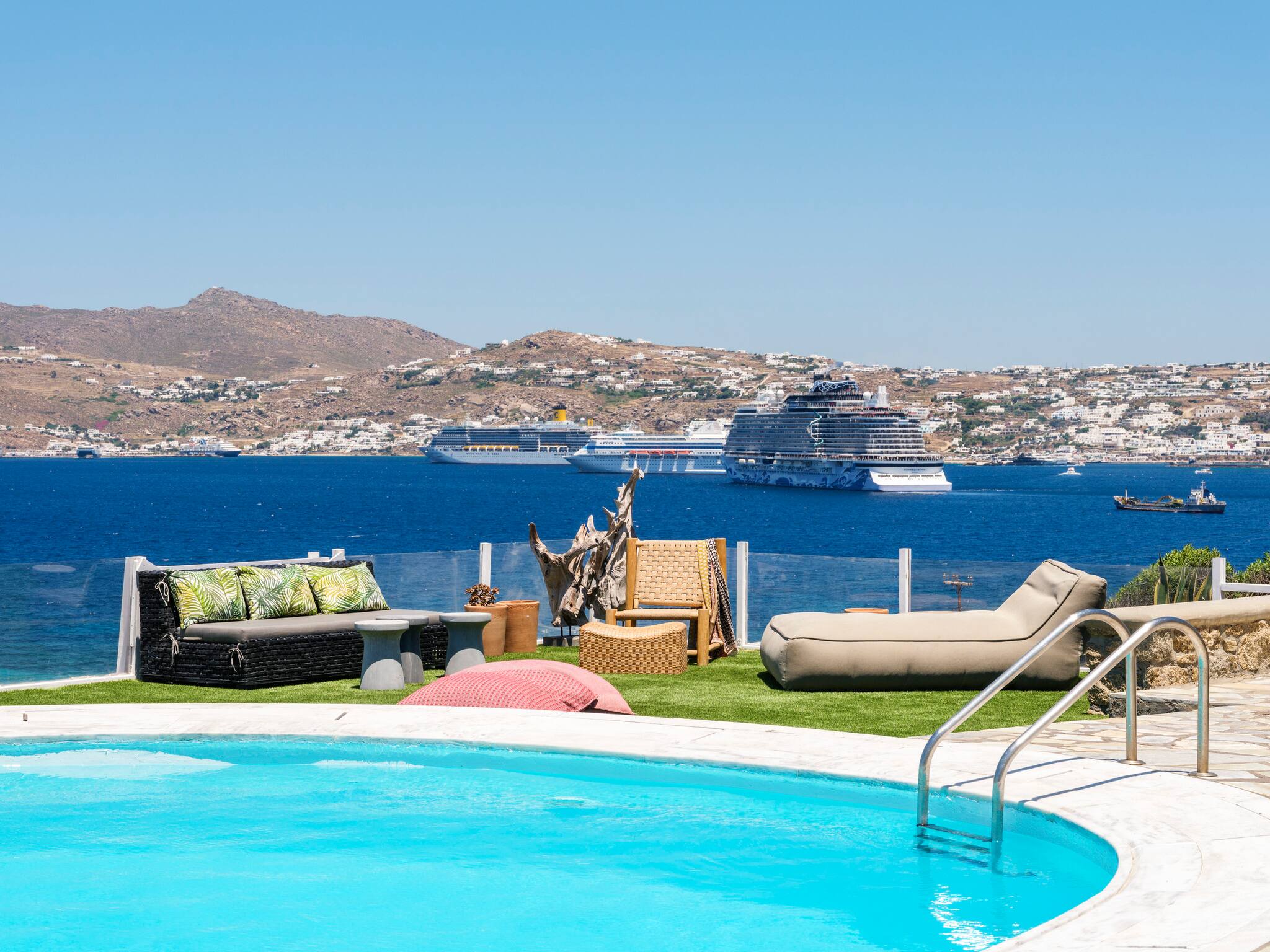 The villa offers breathtaking panoramic sea views extending to the port of Mykonos and Chora. When the cruise ships are illuminated at night, the view is simply magical. The pool area enjoys sunshine throughout the day and stunning sunsets in the evening.