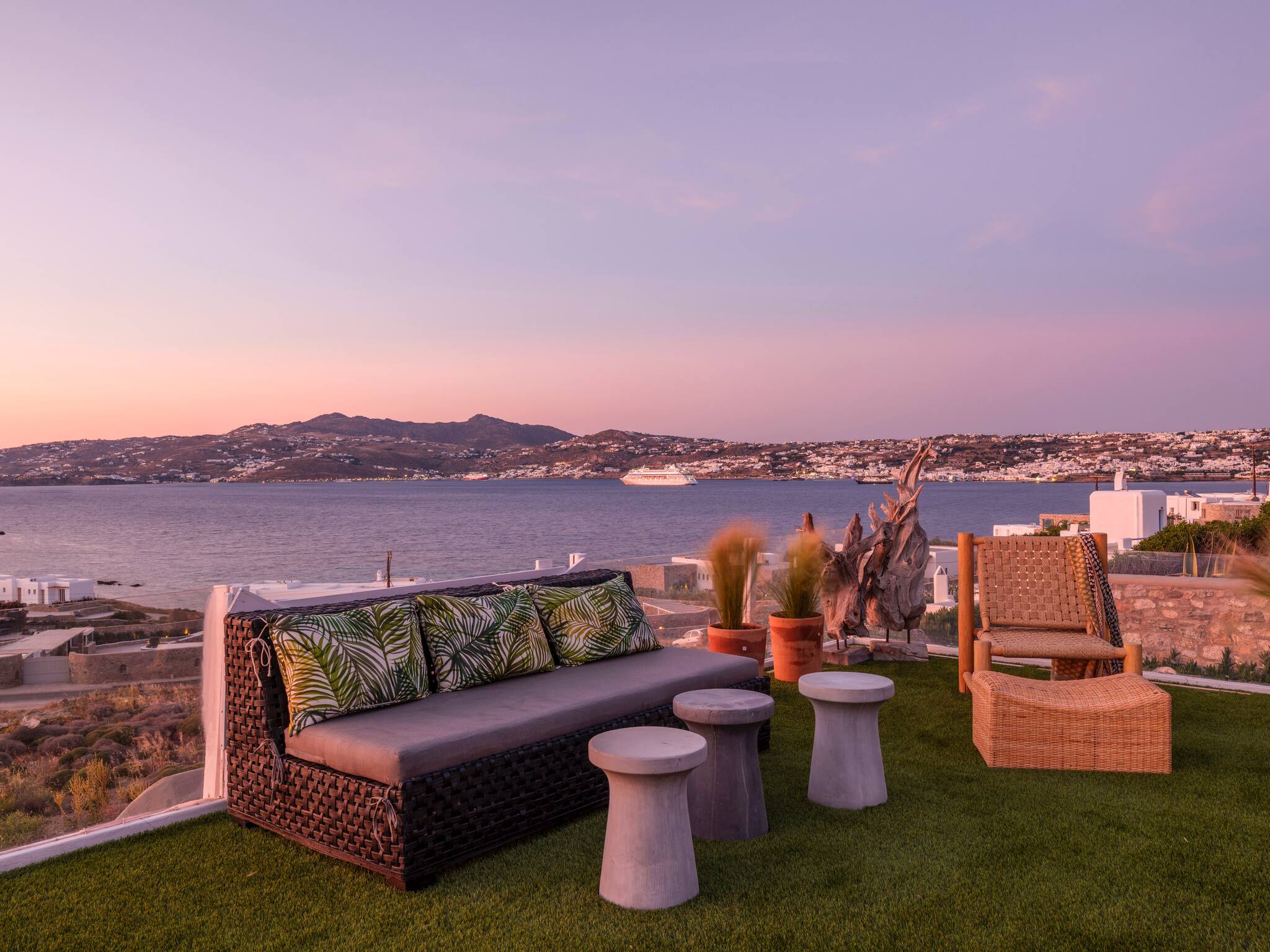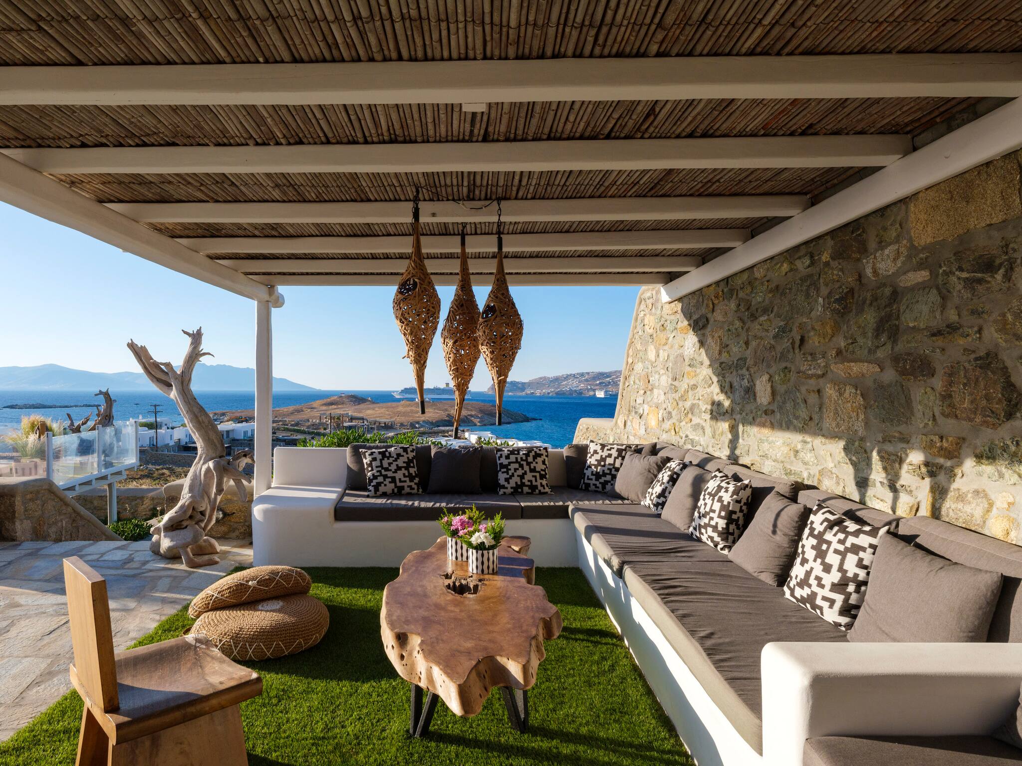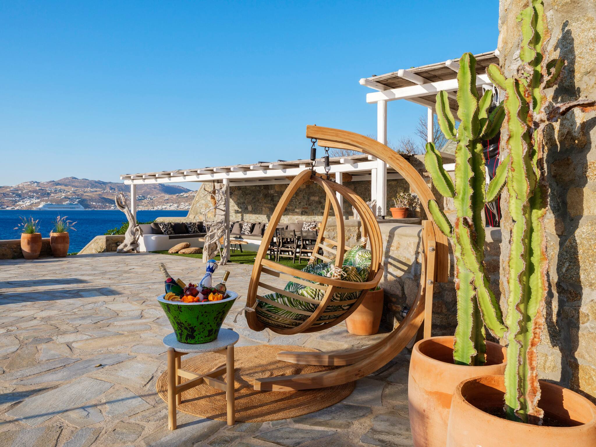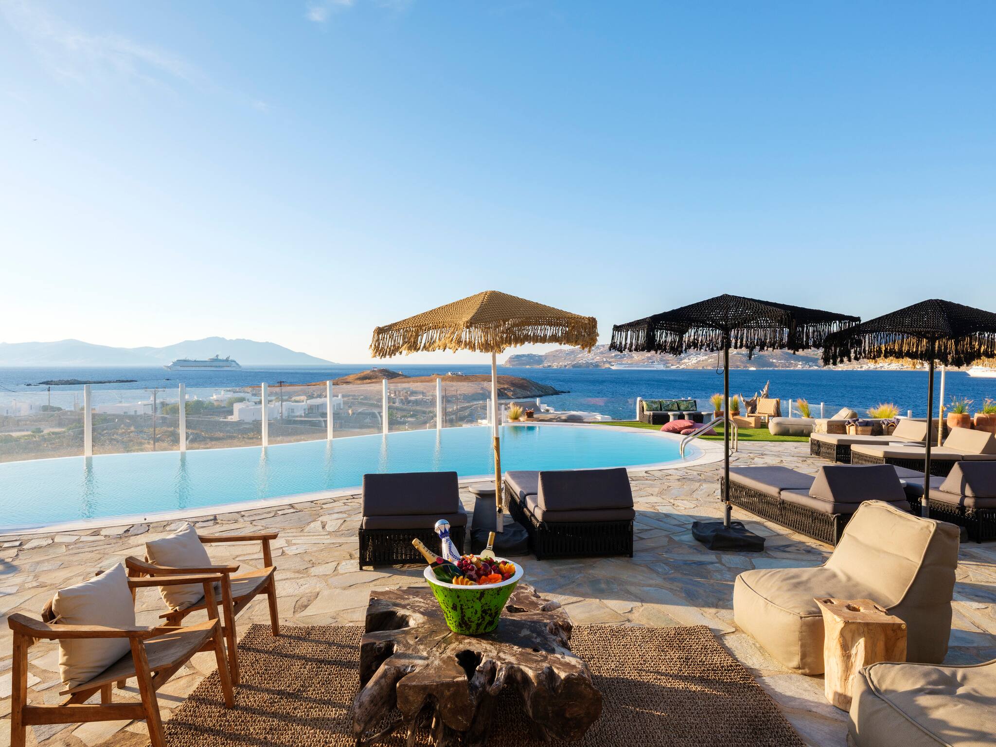 The villa offers breathtaking panoramic sea views extending to the port of Mykonos and Chora. When the cruise ships are illuminated at night, the view is simply magical. The pool area enjoys sunshine throughout the day and stunning sunsets in the evening.