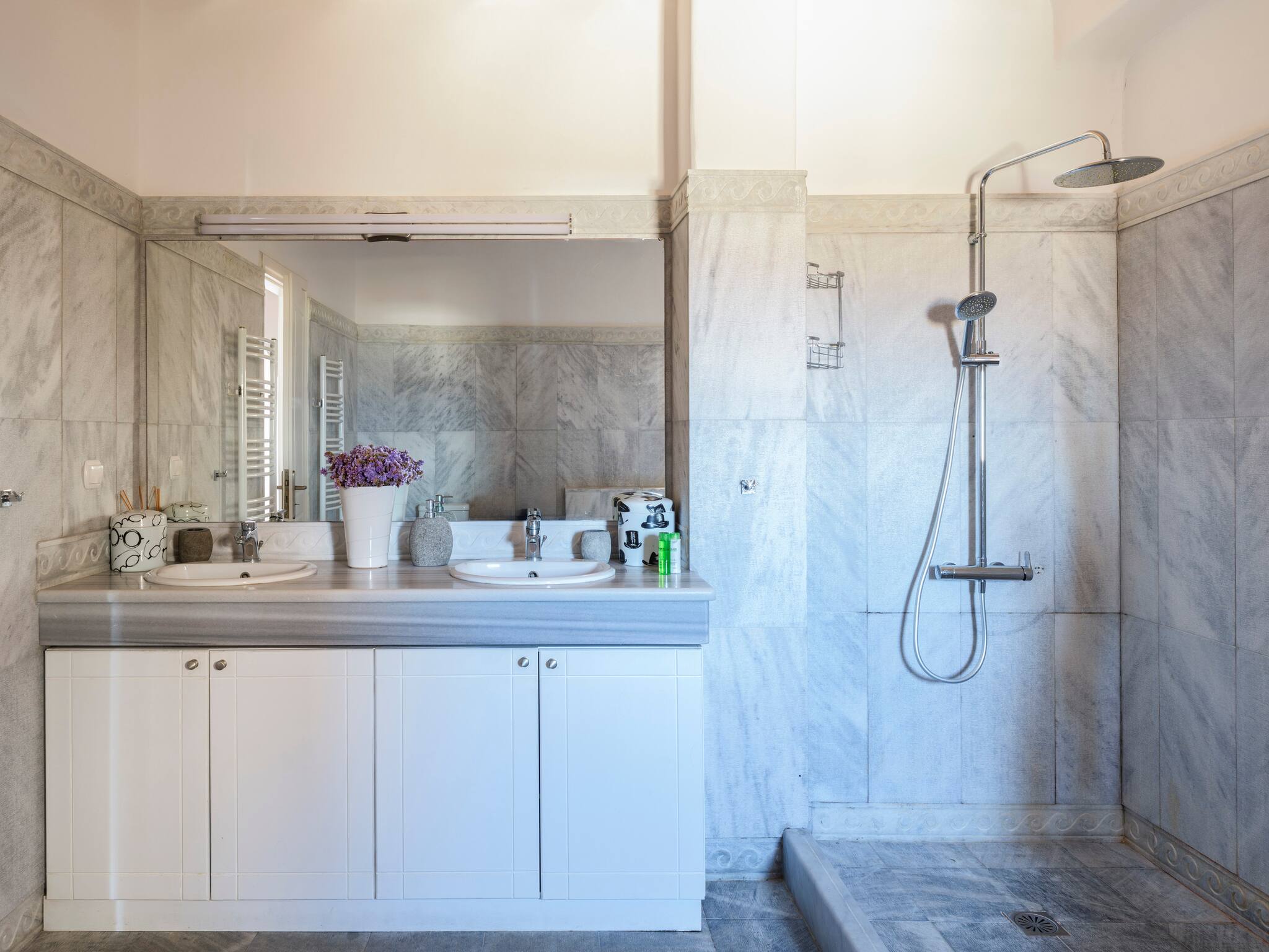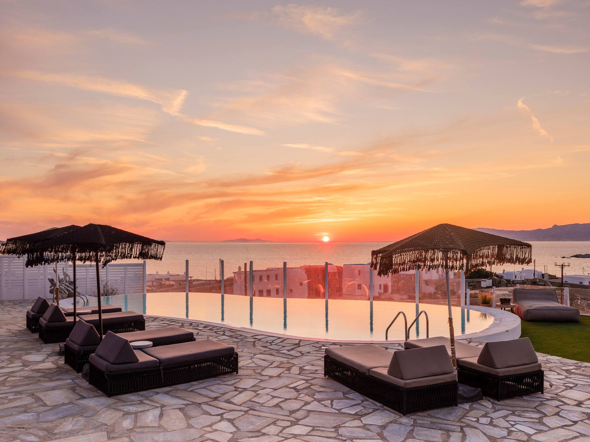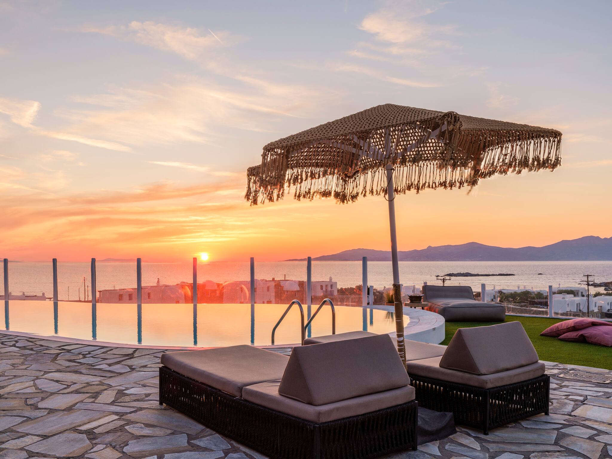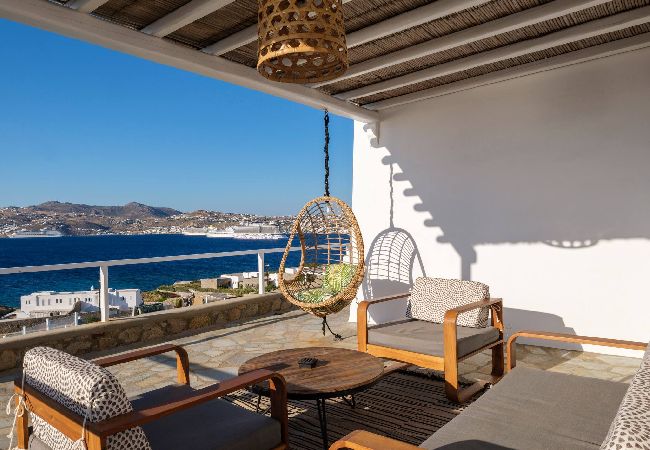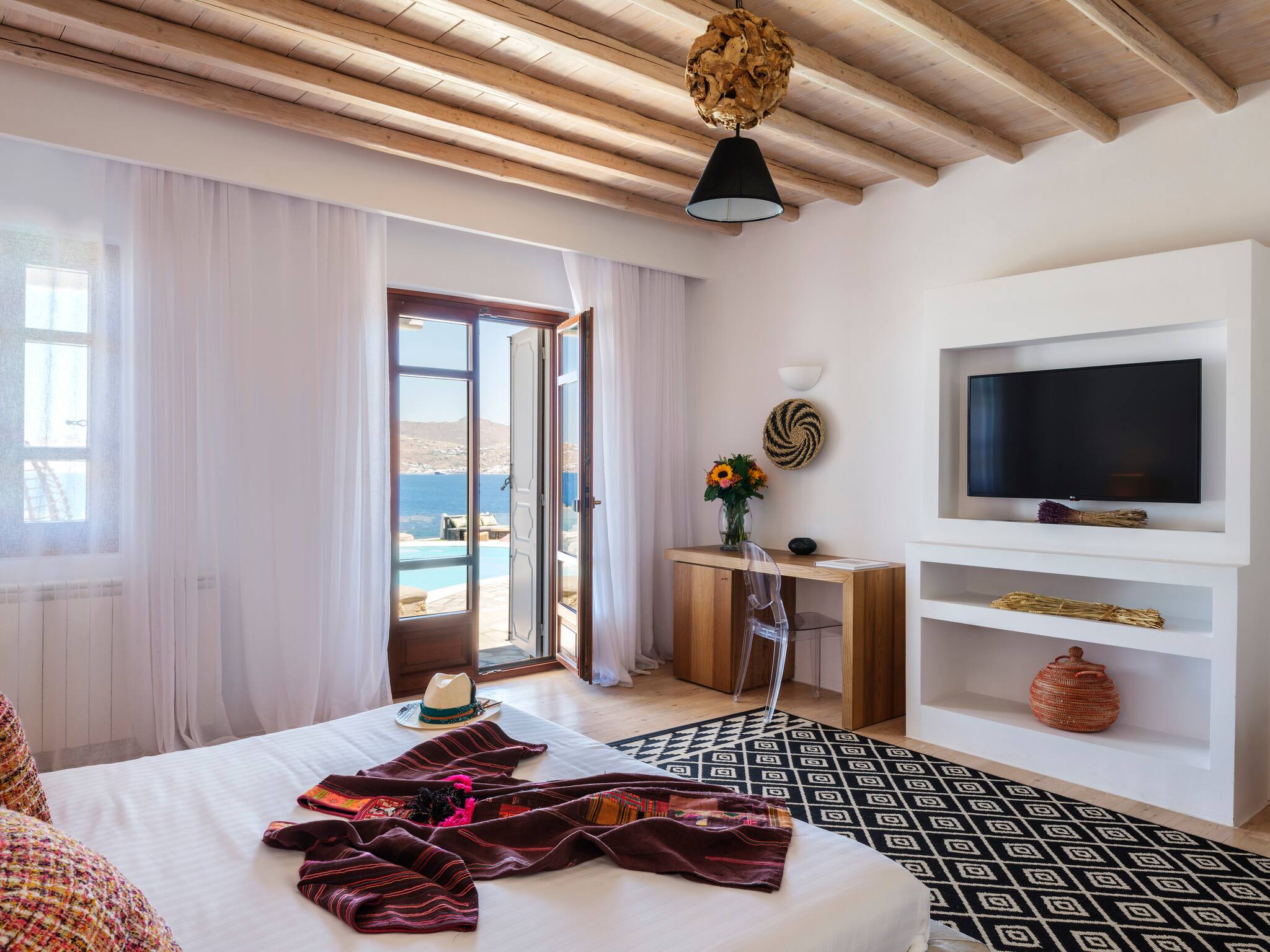 The villa offers breathtaking panoramic sea views extending to the port of Mykonos and Chora. When the cruise ships are illuminated at night, the view is simply magical. The pool area enjoys sunshine throughout the day and stunning sunsets in the evening.