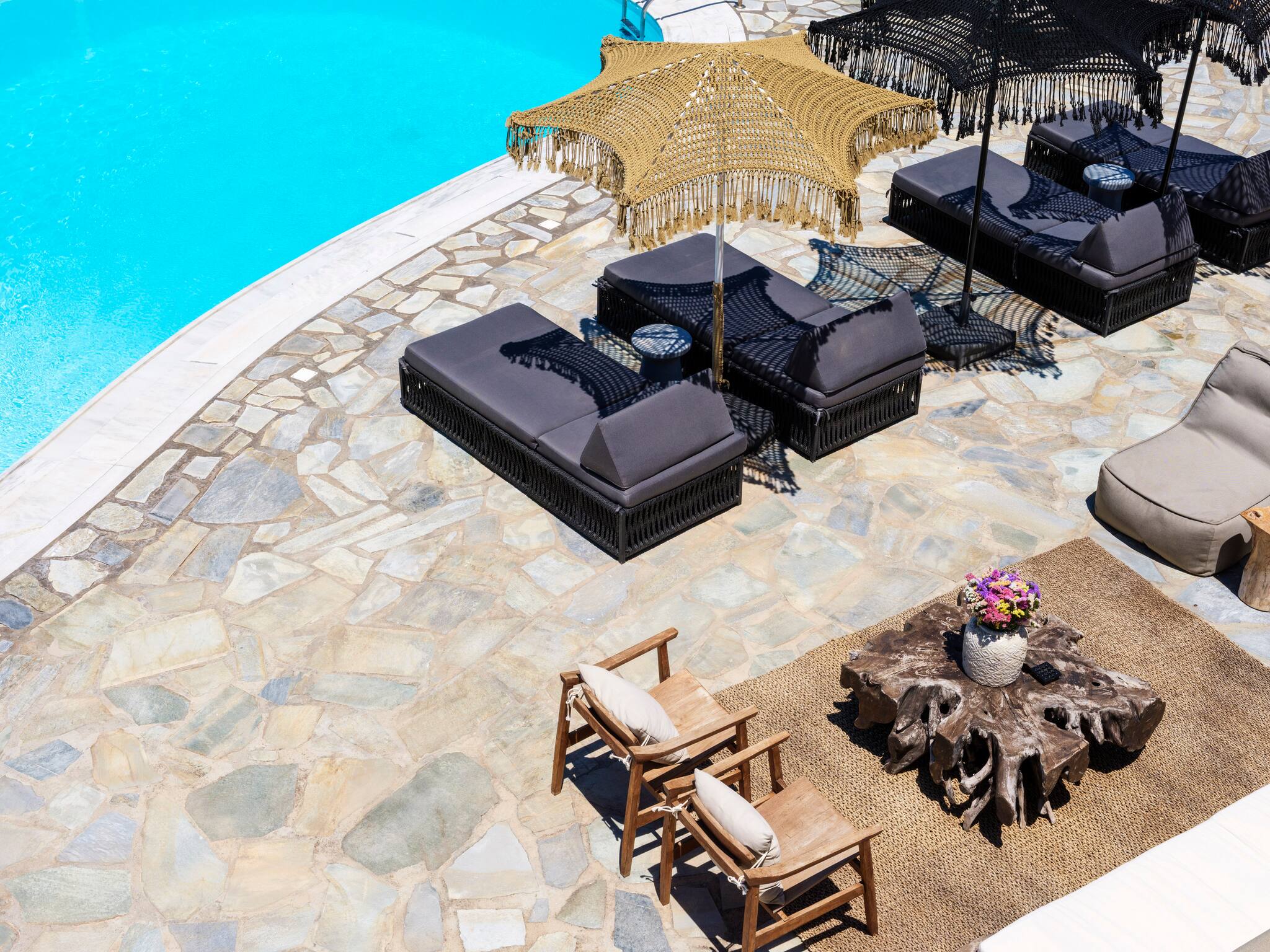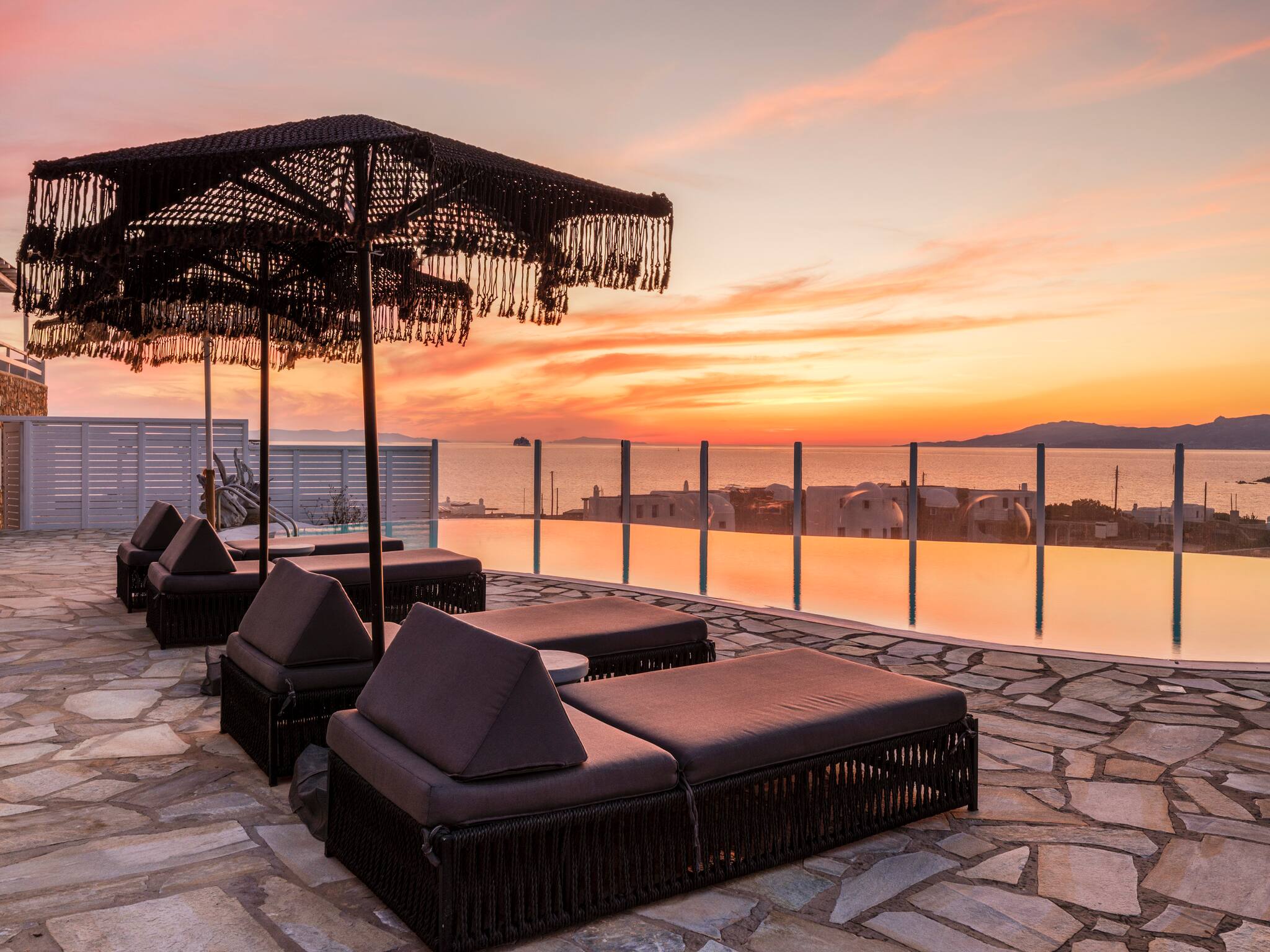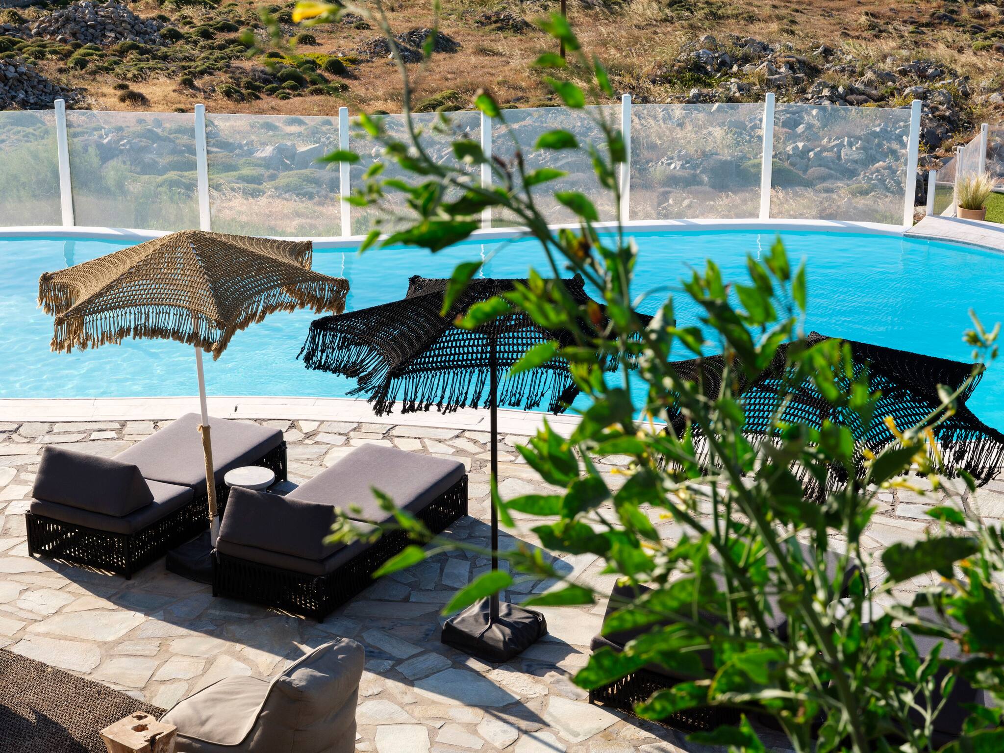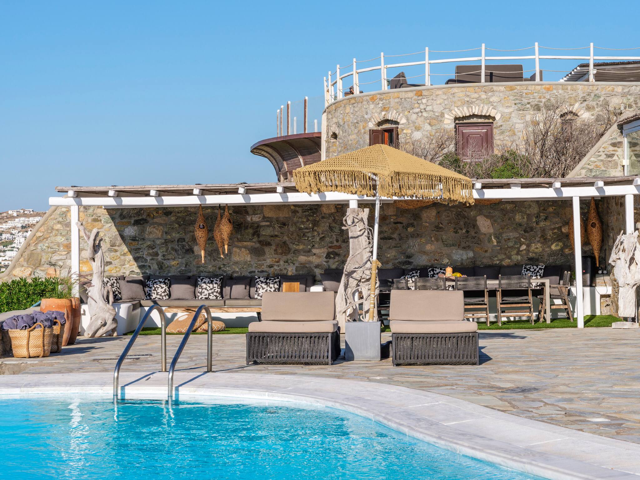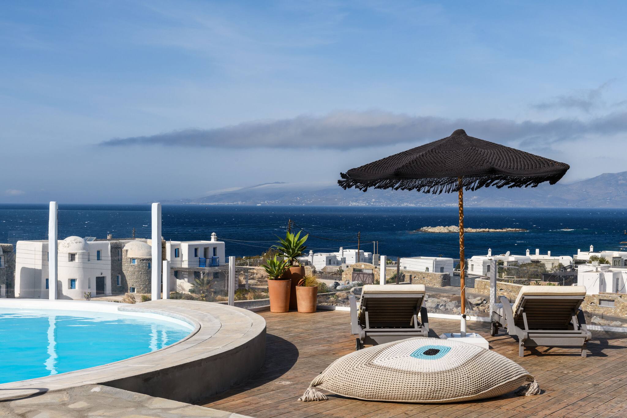 The expansive terrace with numerous sunbeds and lounge areas invites you to relax in complete privacy. Enjoy cocktails by the pool while watching the sunset over Ornos Bay or take a short drive to Mykonos Town to experience the island’s cosmopolitan nightlife.