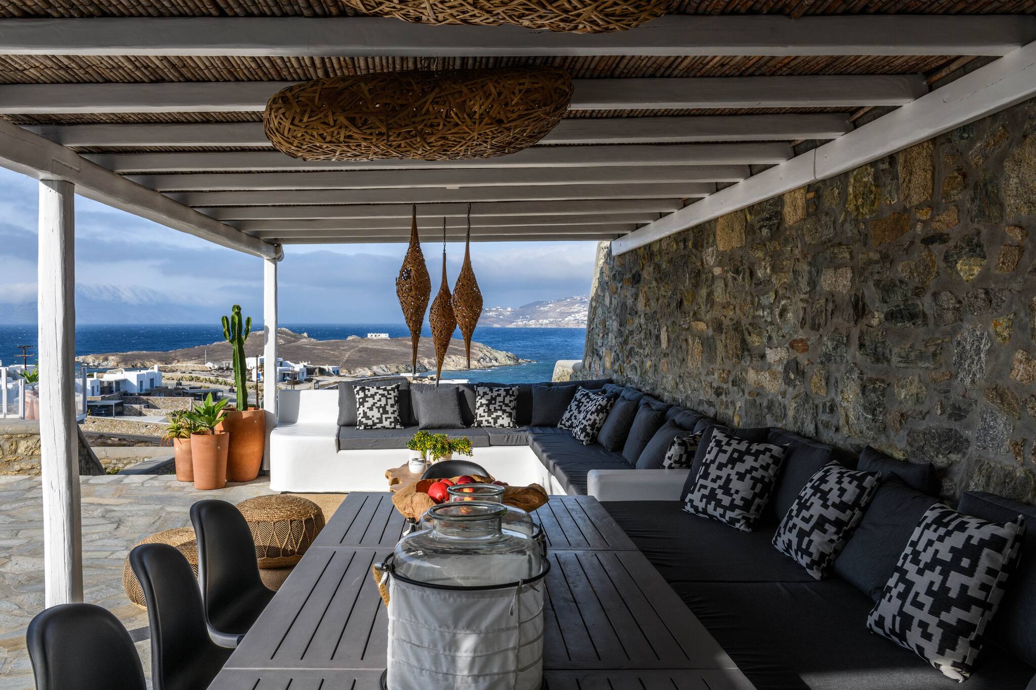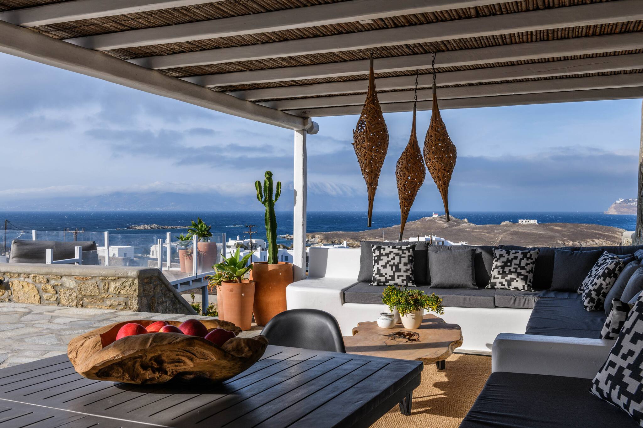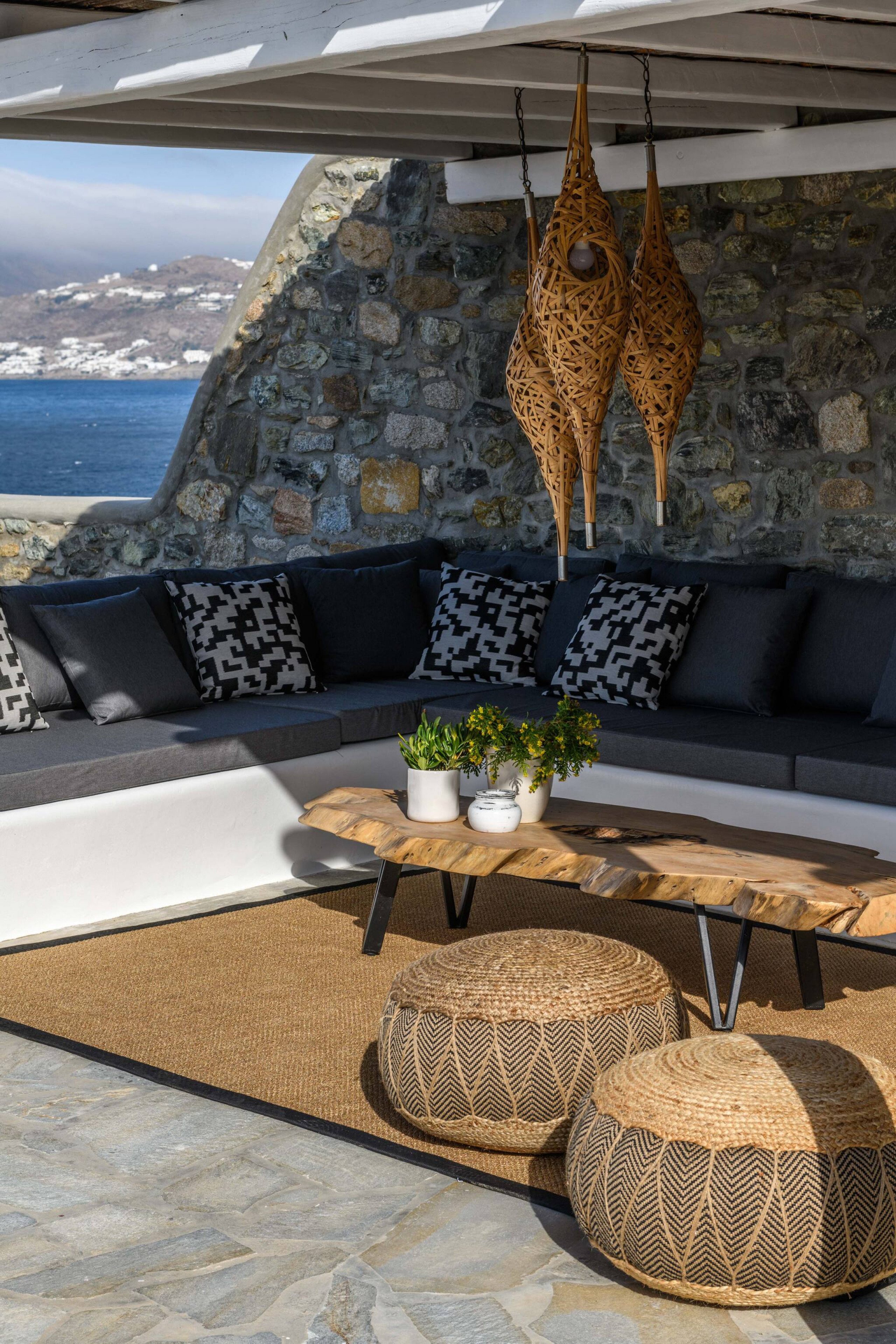 Thanks to its thoughtful architecture, the villa offers maximum privacy and protection from the wind, allowing guests to enjoy views of the surrounding landscape and sea from any of the many outdoor seating areas.
