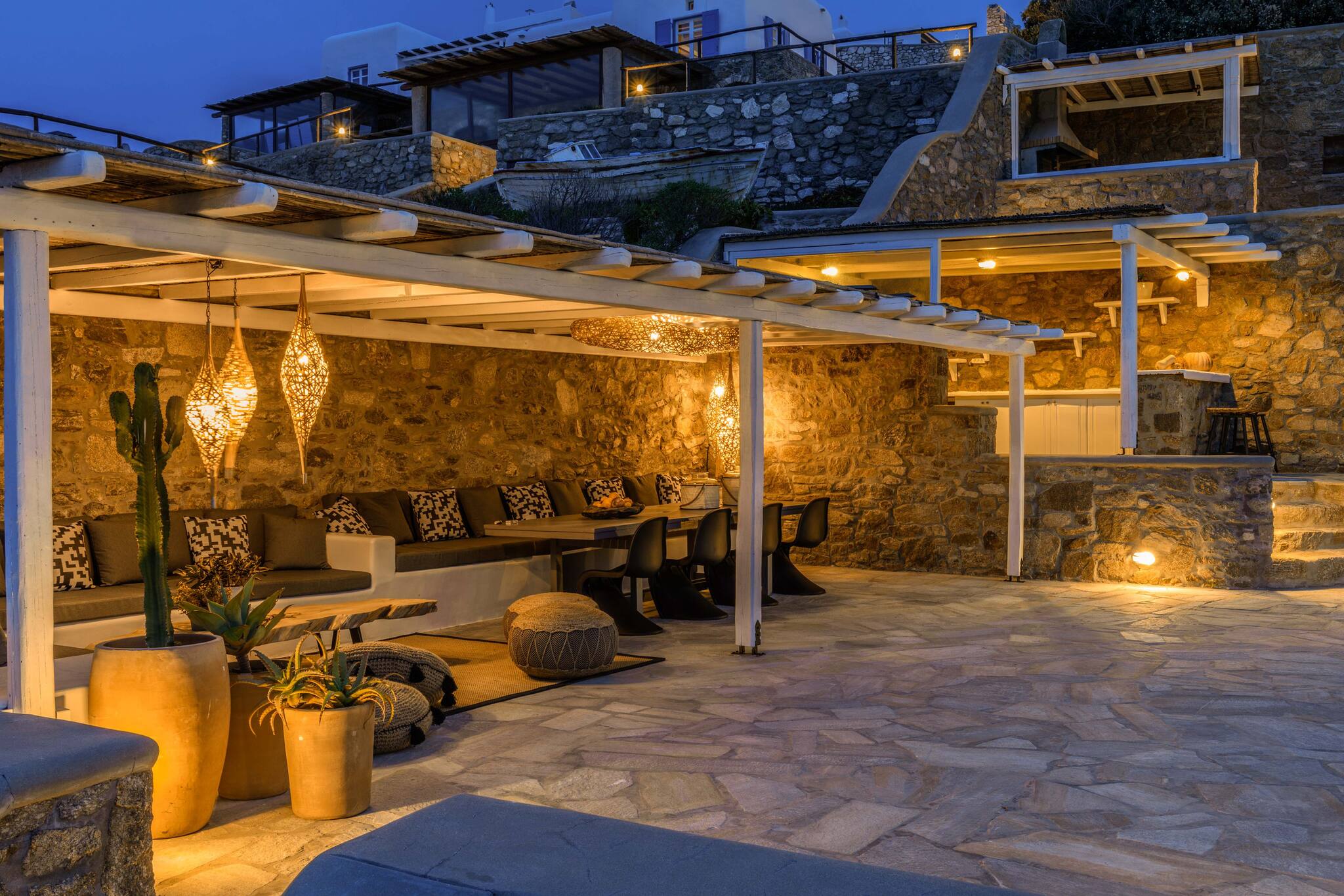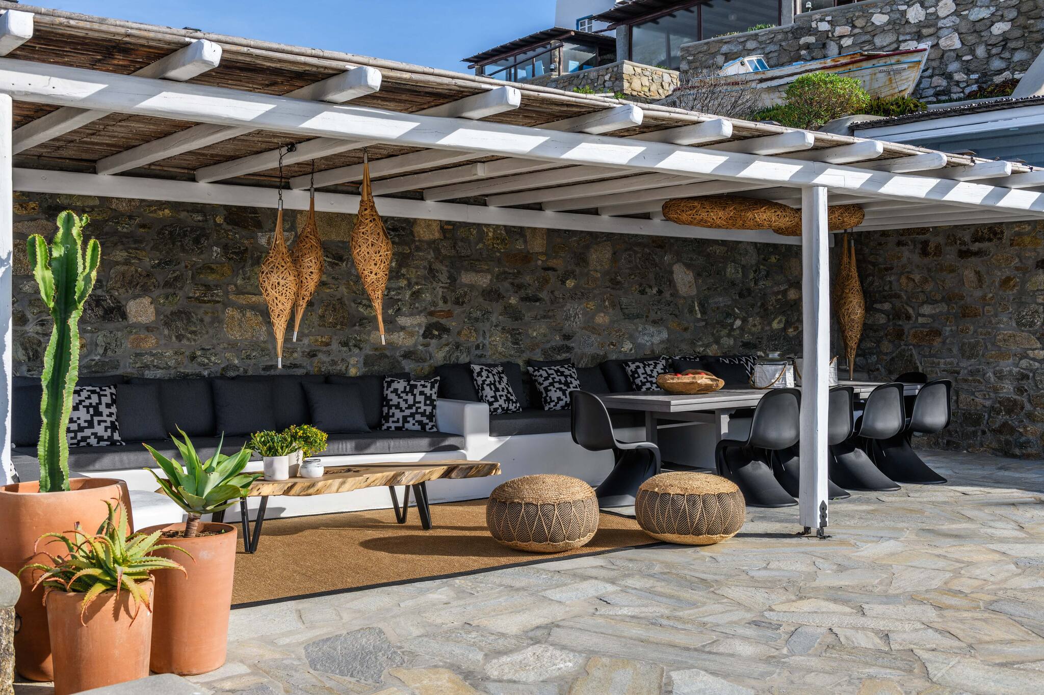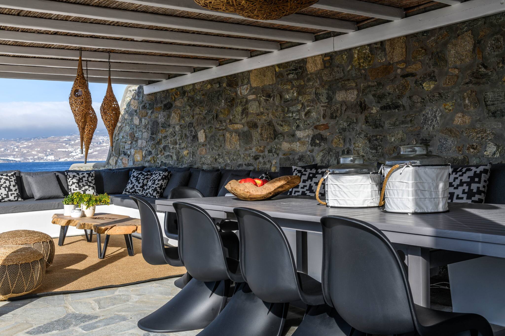 Thanks to its thoughtful architecture, the villa offers maximum privacy and protection from the wind, allowing guests to enjoy views of the surrounding landscape and sea from any of the many outdoor seating areas.