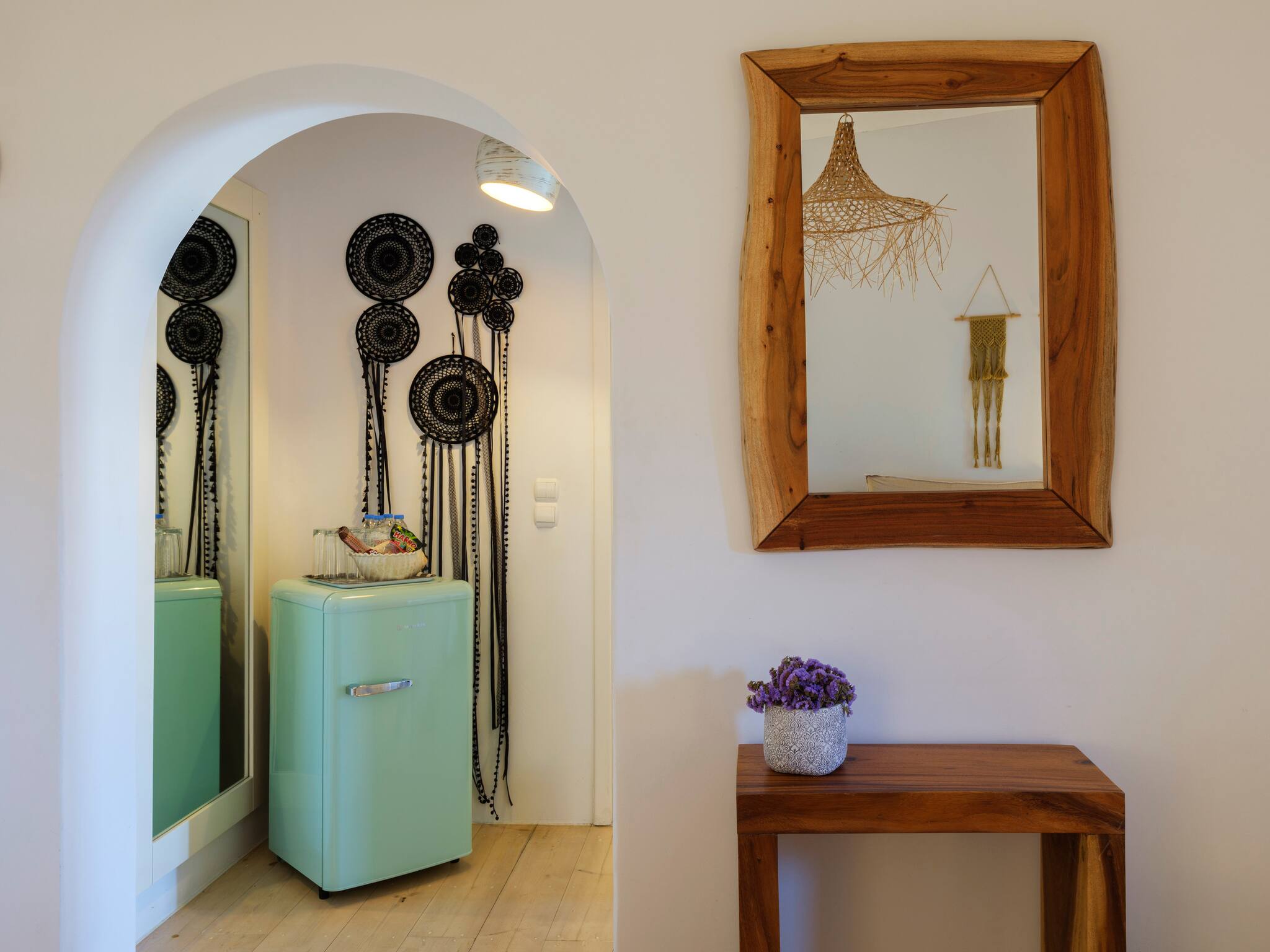 Her refined sense of style and authenticity is reflected in every element: the whitewashed walls that blend into the landscape, the gentle curves of the architecture, and the shaded dining areas framed by vines and blooming bougainvillea.