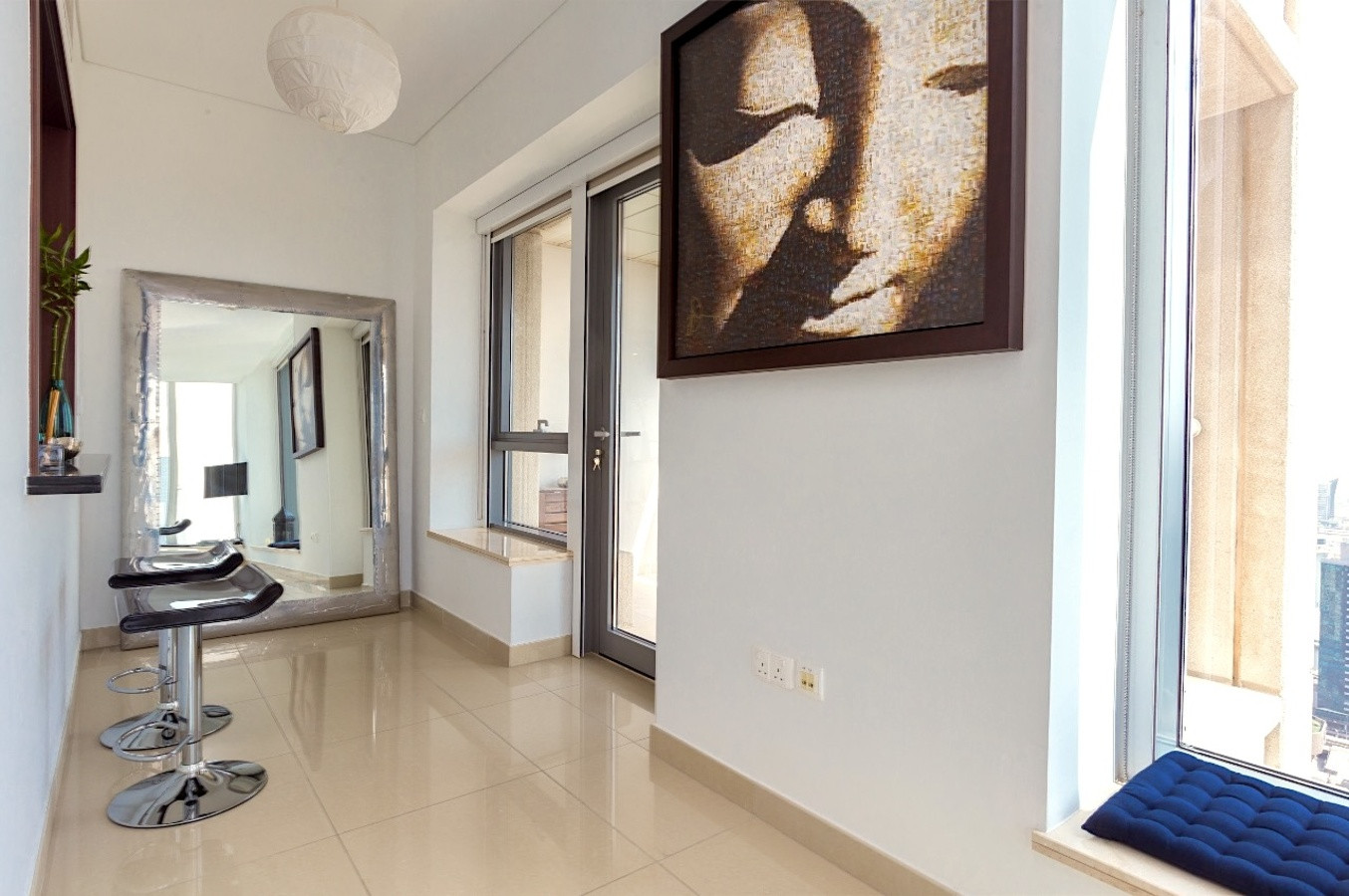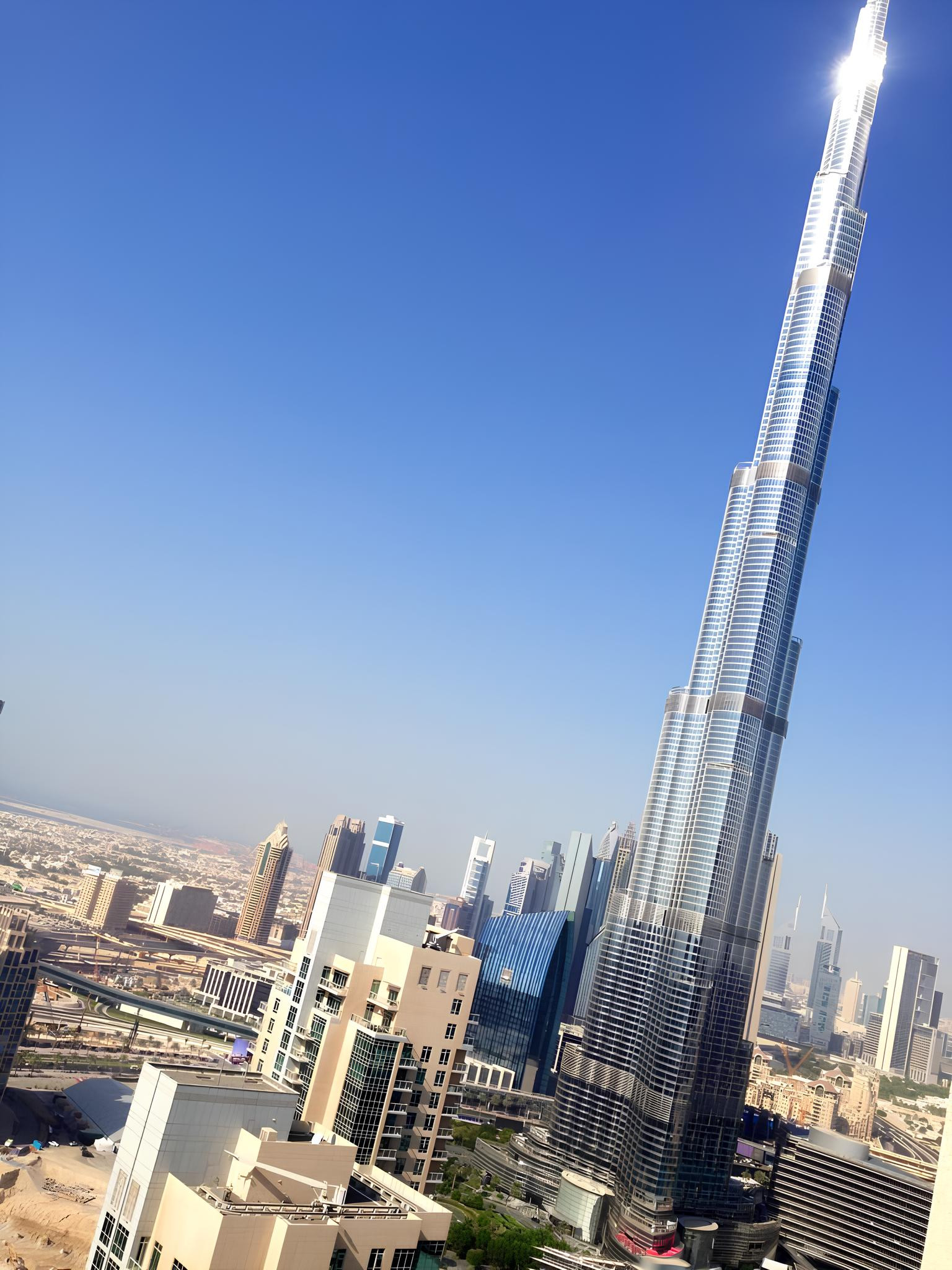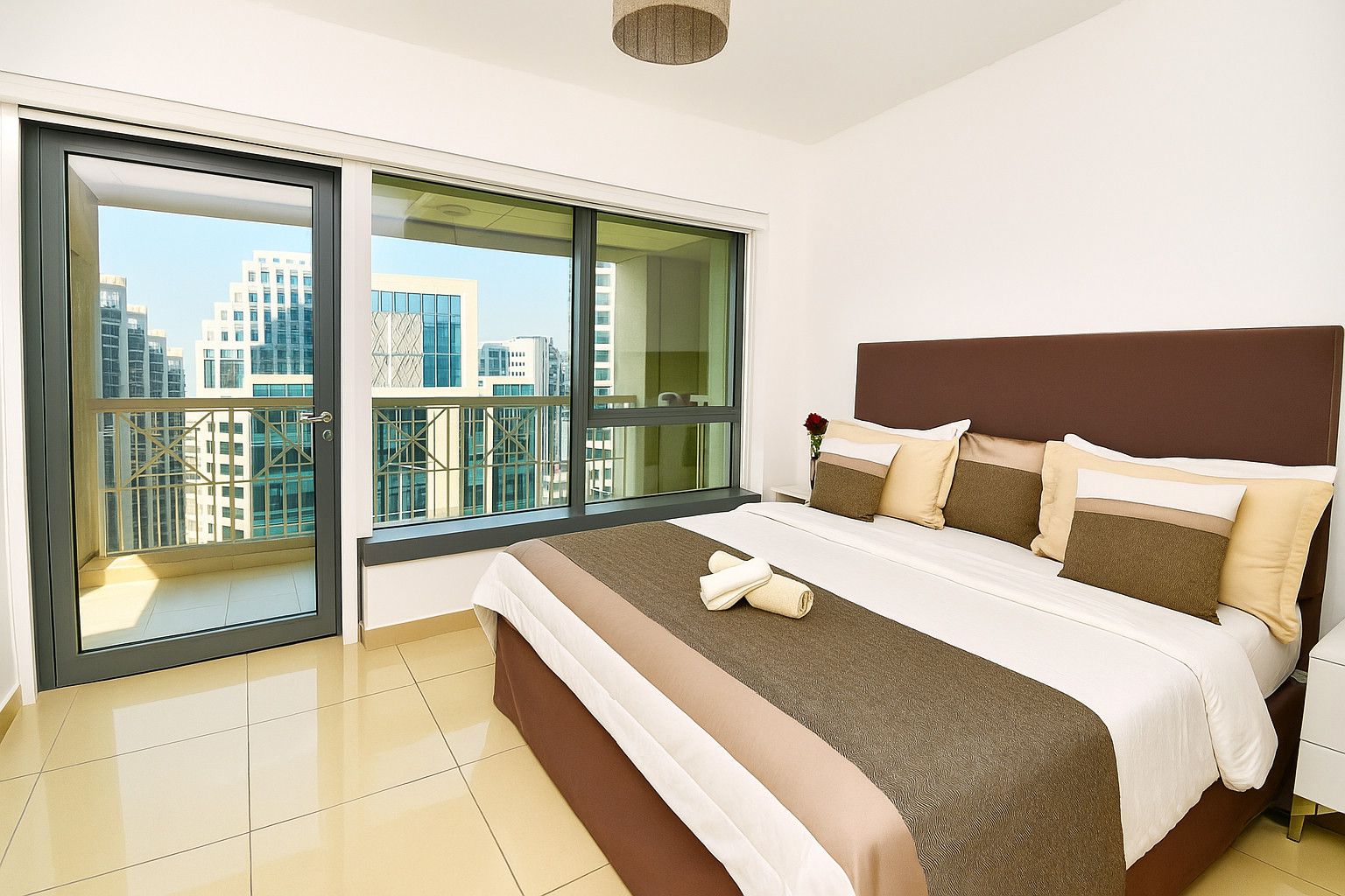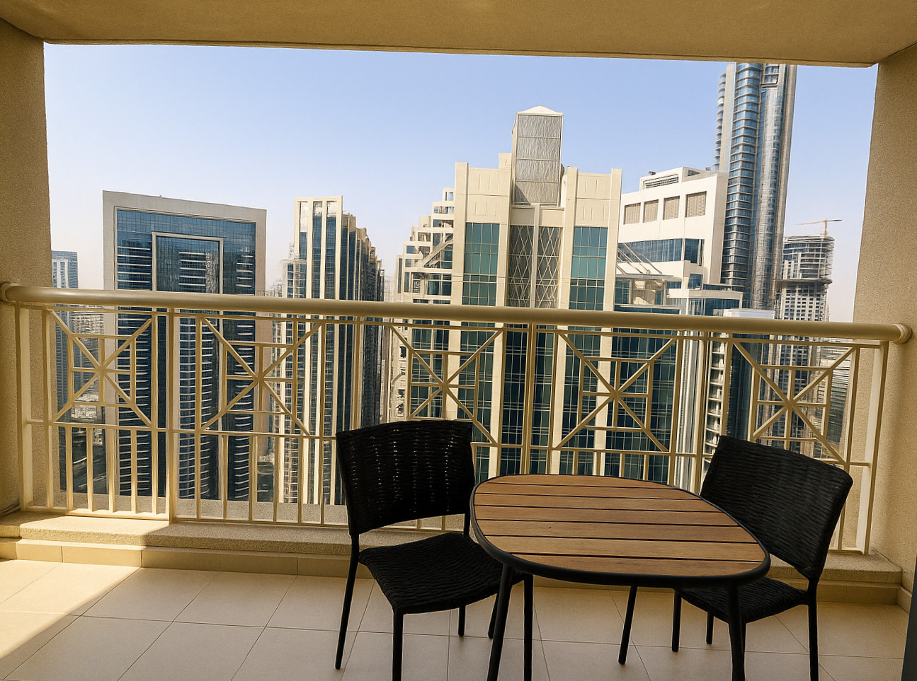 Diese stilvolle Wohnung im 43. Stock bietet einen der spektakulärsten Ausblicke der Stadt – besonders bei Nacht, wenn die Skyline in tausend Lichtern erstrahlt und der Burj Khalifa wie auf der Hand funkelt.